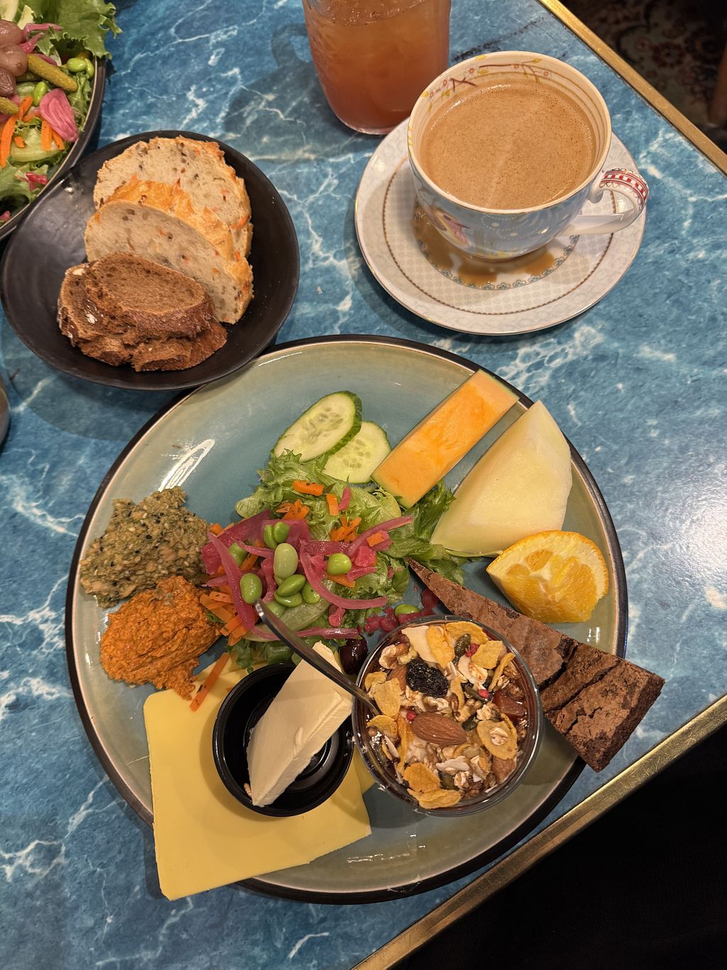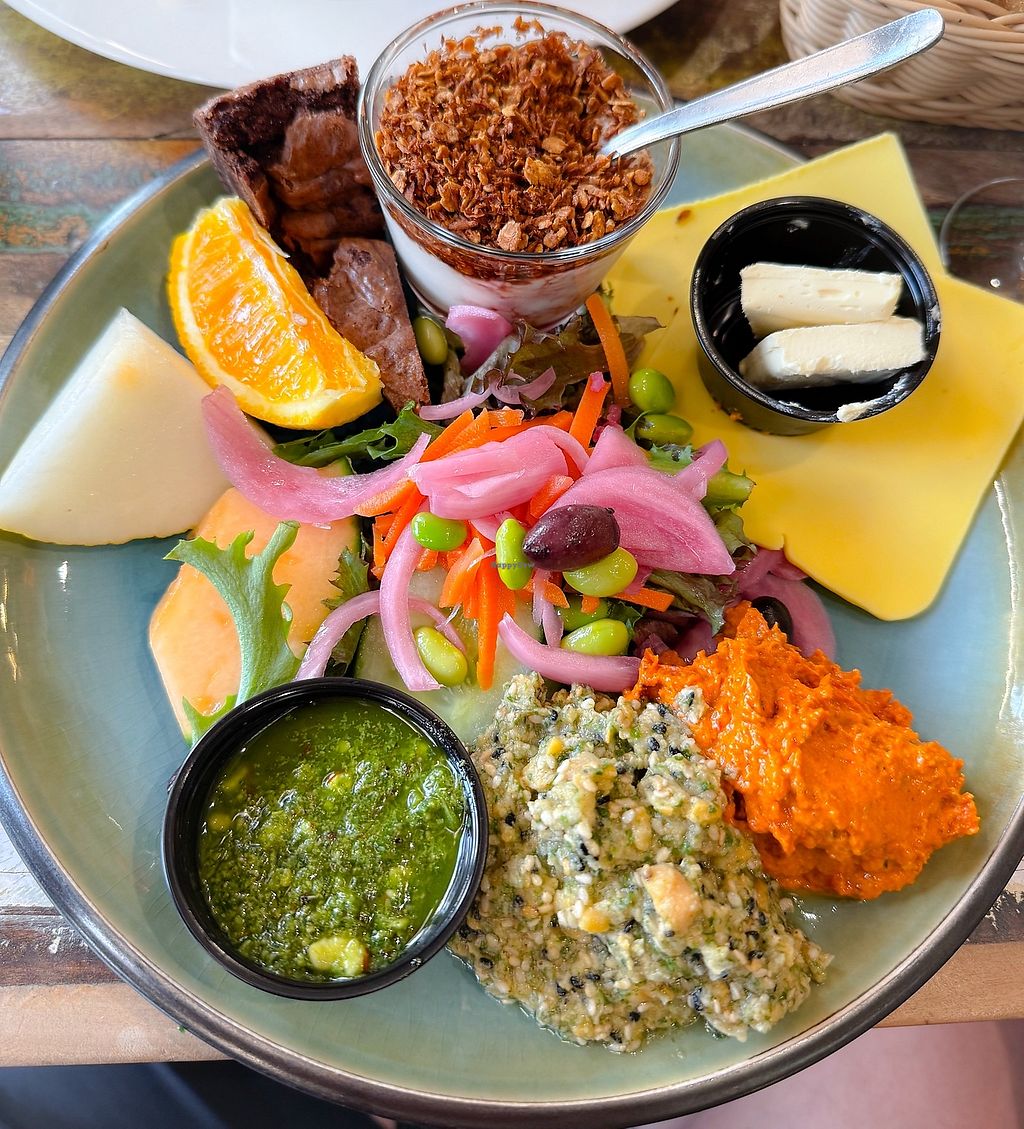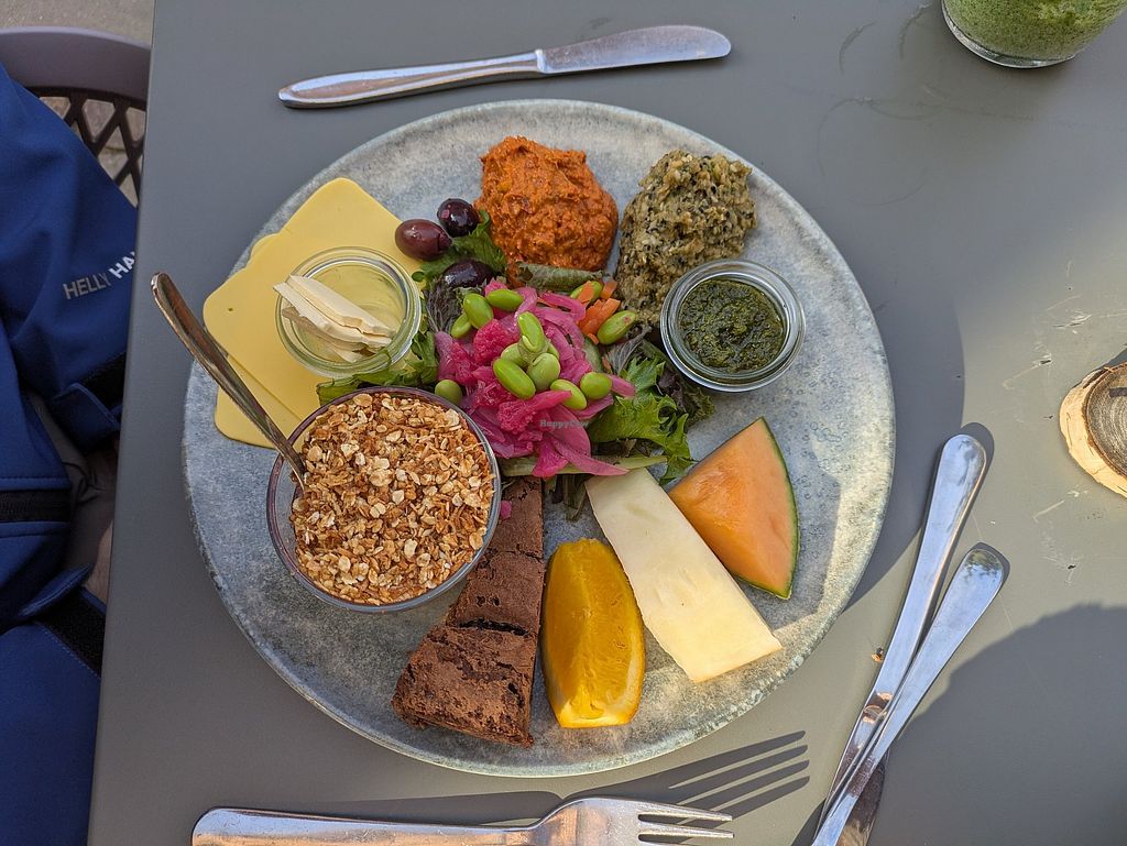 very goood! will come back. vegan cheese, pesto, avjar, butter, brownie, fruit, greeens, yoghurt, muesli and bread #Veganuary