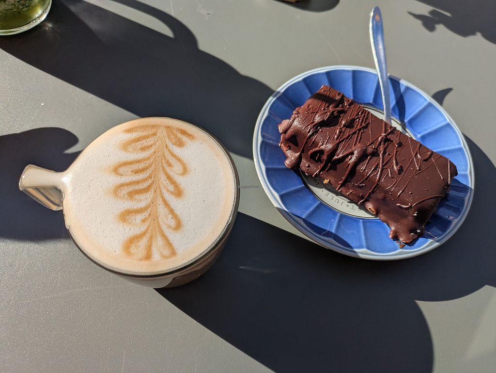 Great selection of vegan food and sweets, good coffee (oat, soy and almond milk) and very friendly staff. They welcomed our dog warmly and gave him some water.