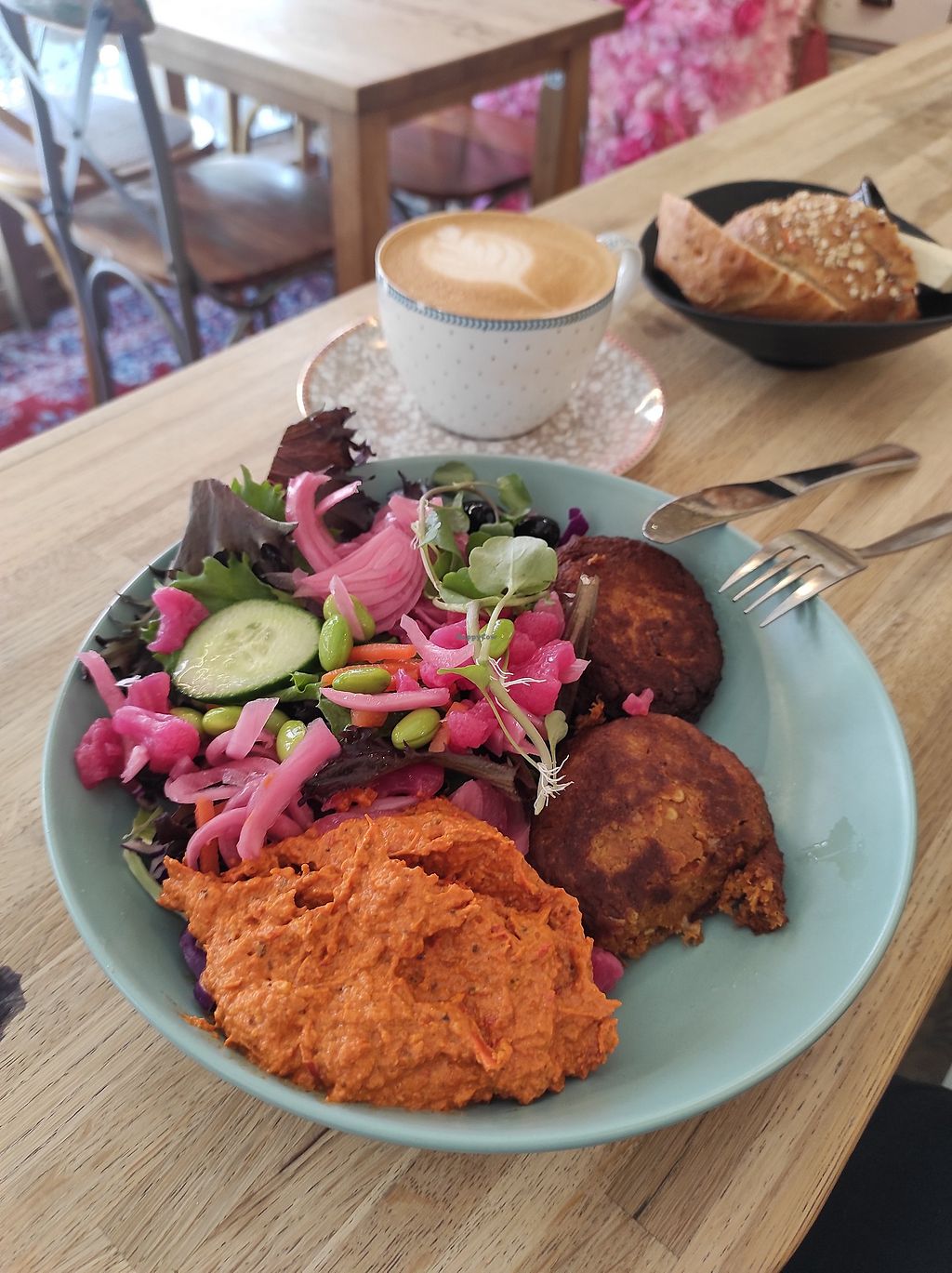 Sourbreadrolls with different options. Vegan butter and cheese, hummus. Good to get different for sharing. Falafelsalad was great. Different cakes and all vegan option well labeled. Friendly, helpfull staff and atmosphere.