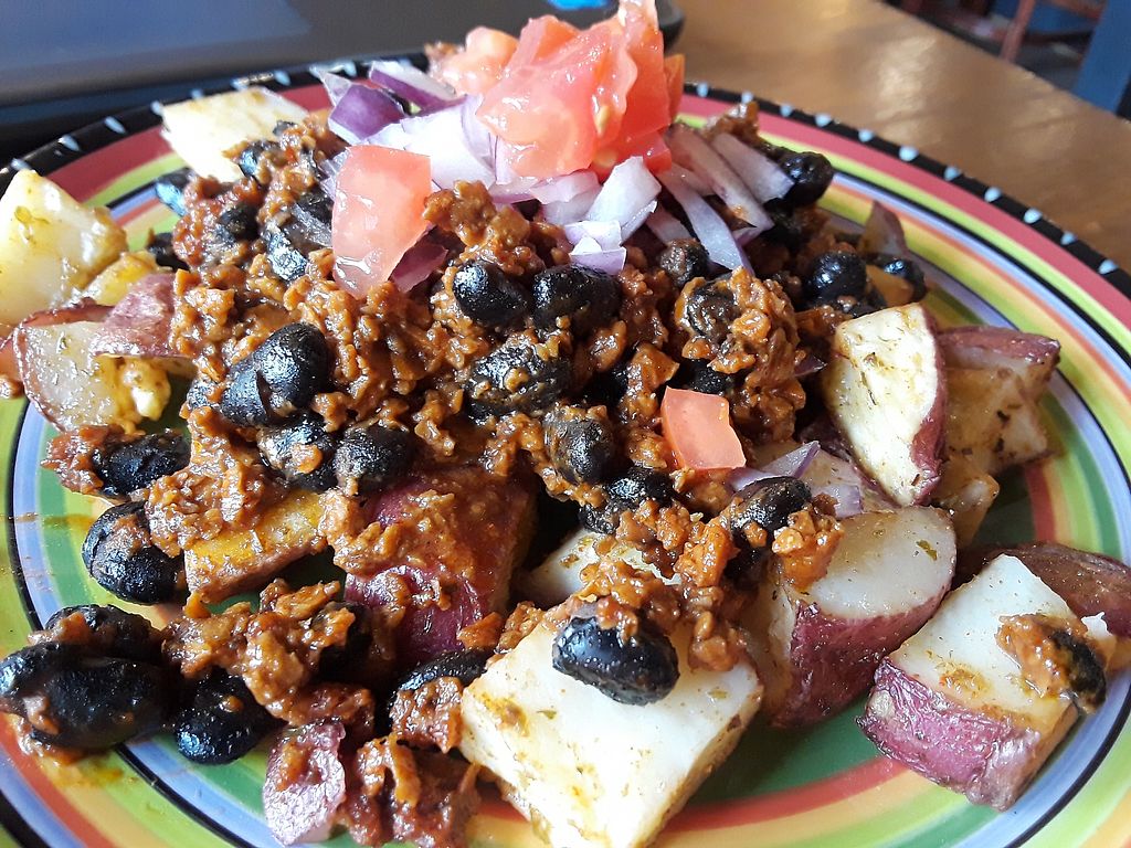 Let's start with the food: they have a separate vegan menu for entrees and lots of vegan pastries. I got the vegan breakfast potato nachos, which were super tasty and reasonably priced.