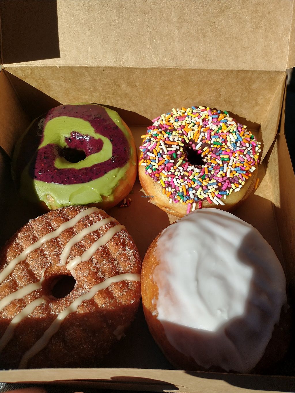 A Cookies & Cream doughnut w/ peanut butter drizzled, a Malted Blue & …