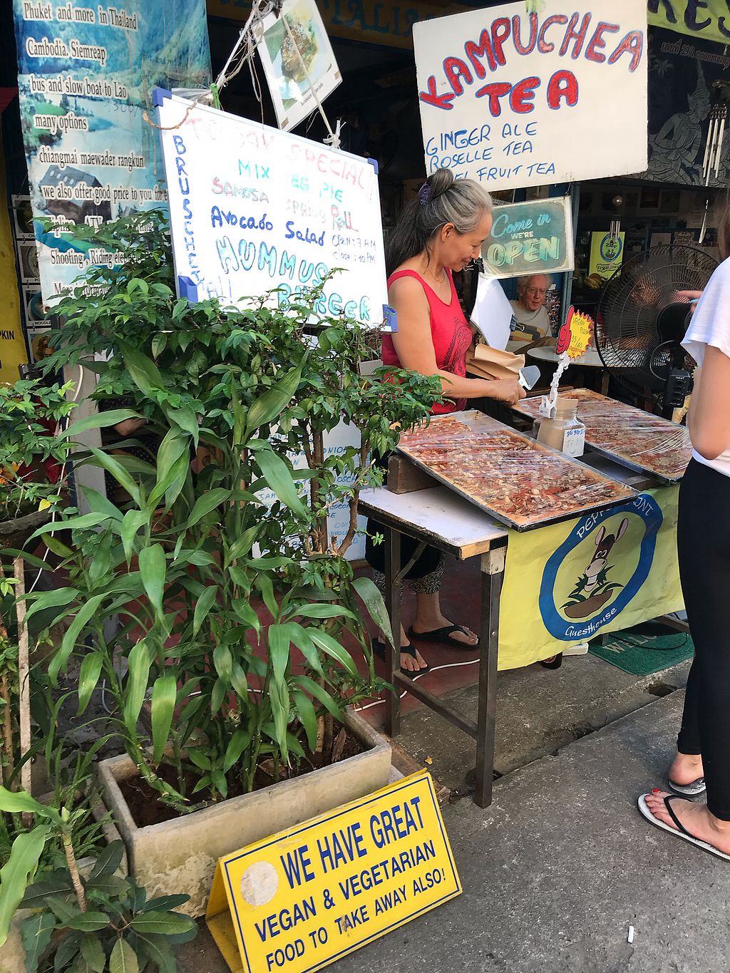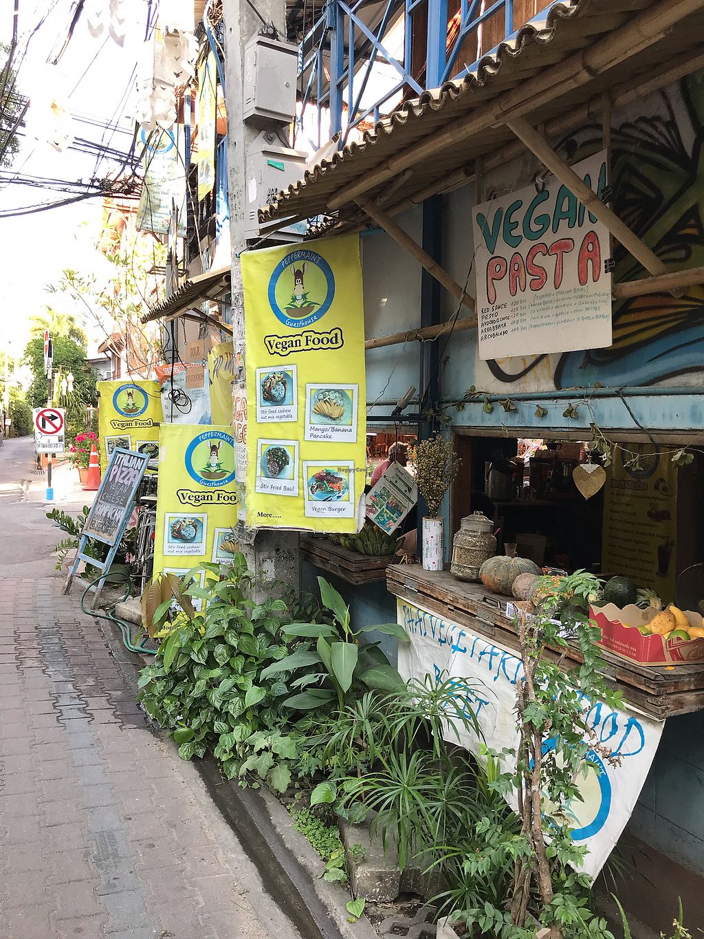 Peppermaint Guest House restaurant is a short walk from the fruit and veg market in Soi 6 Moon Muang Road ... I called in for breakfast and had coffee and a slice (square) of great tasting vegan pizza (฿70) and topped up with fruit from the market ... the restaurant is in a great location and has a nice atmosphere