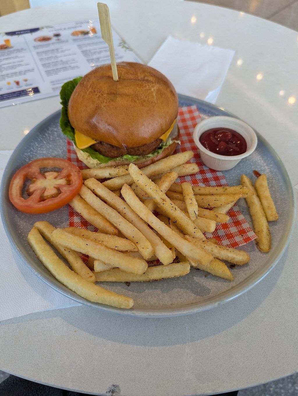 Standard vegan burger with chips but was actually very tasty! Looked at a few other menus in the airport before deciding and am glad we came here