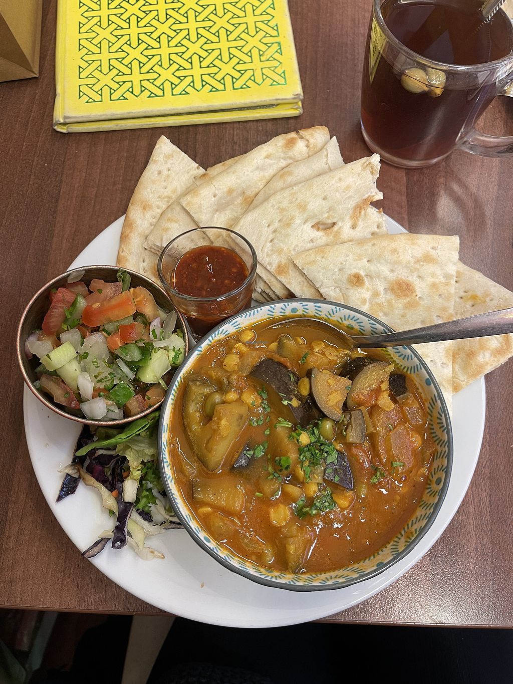 Chickpea curry, cauliflower and potato curry, saffron rice and salad (โฆ