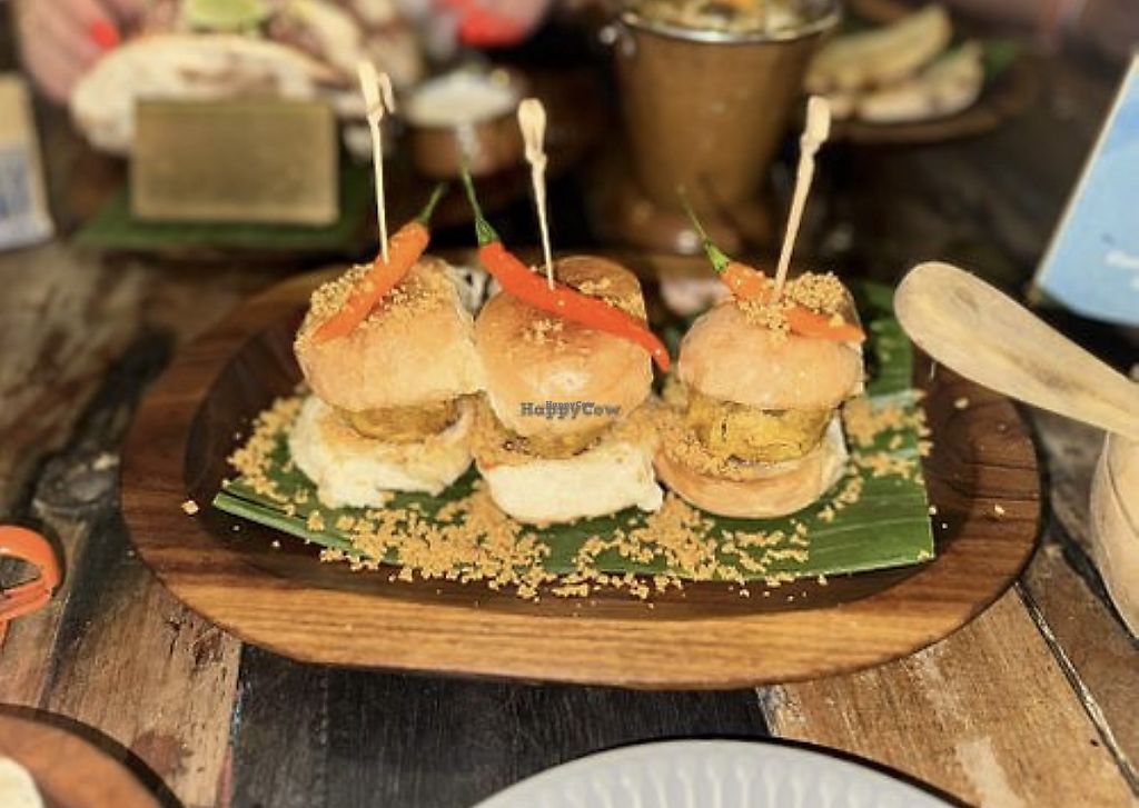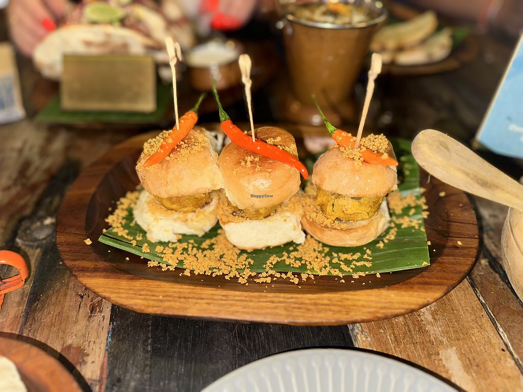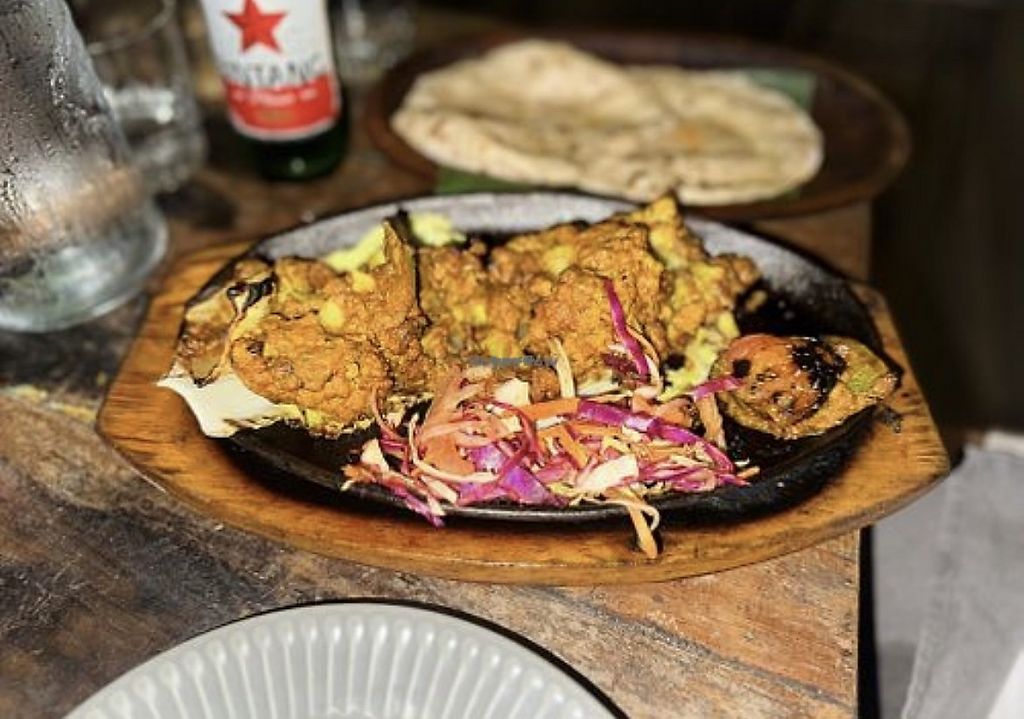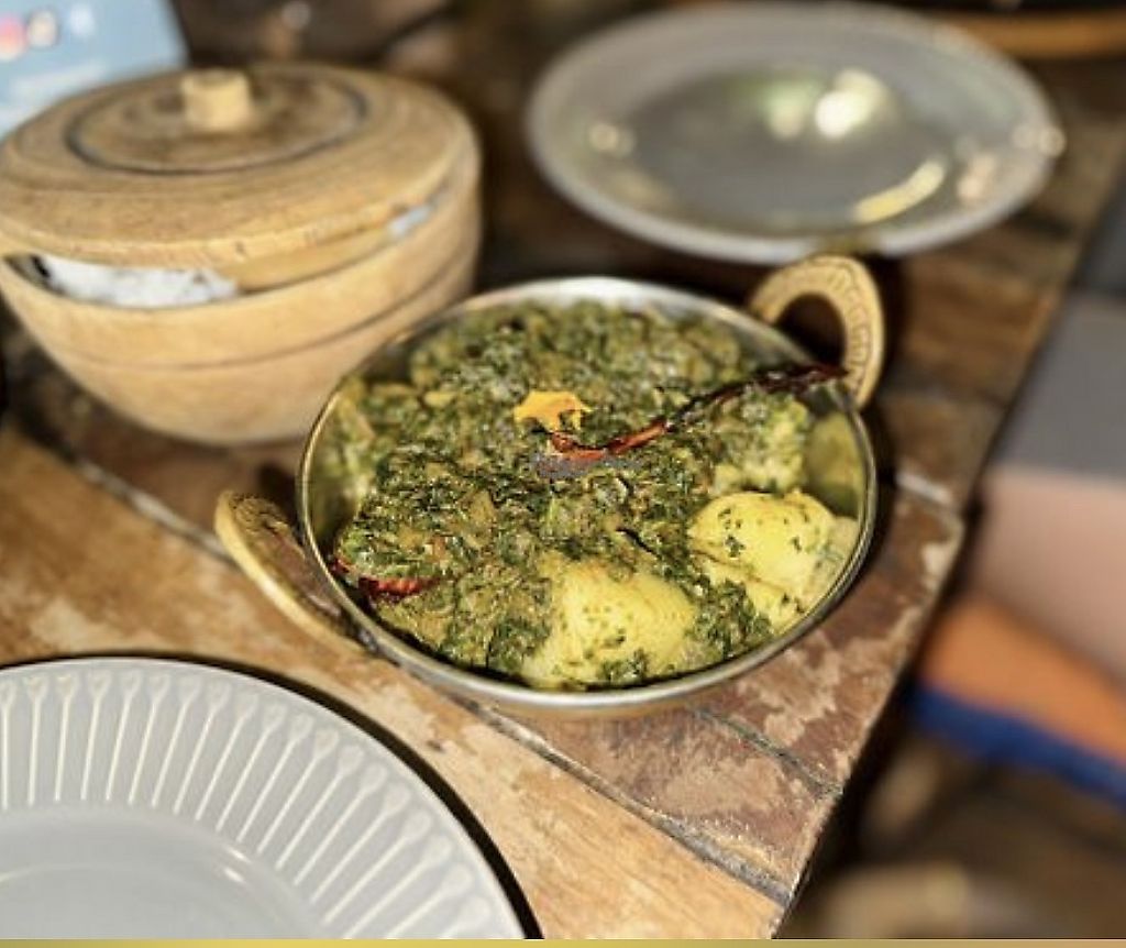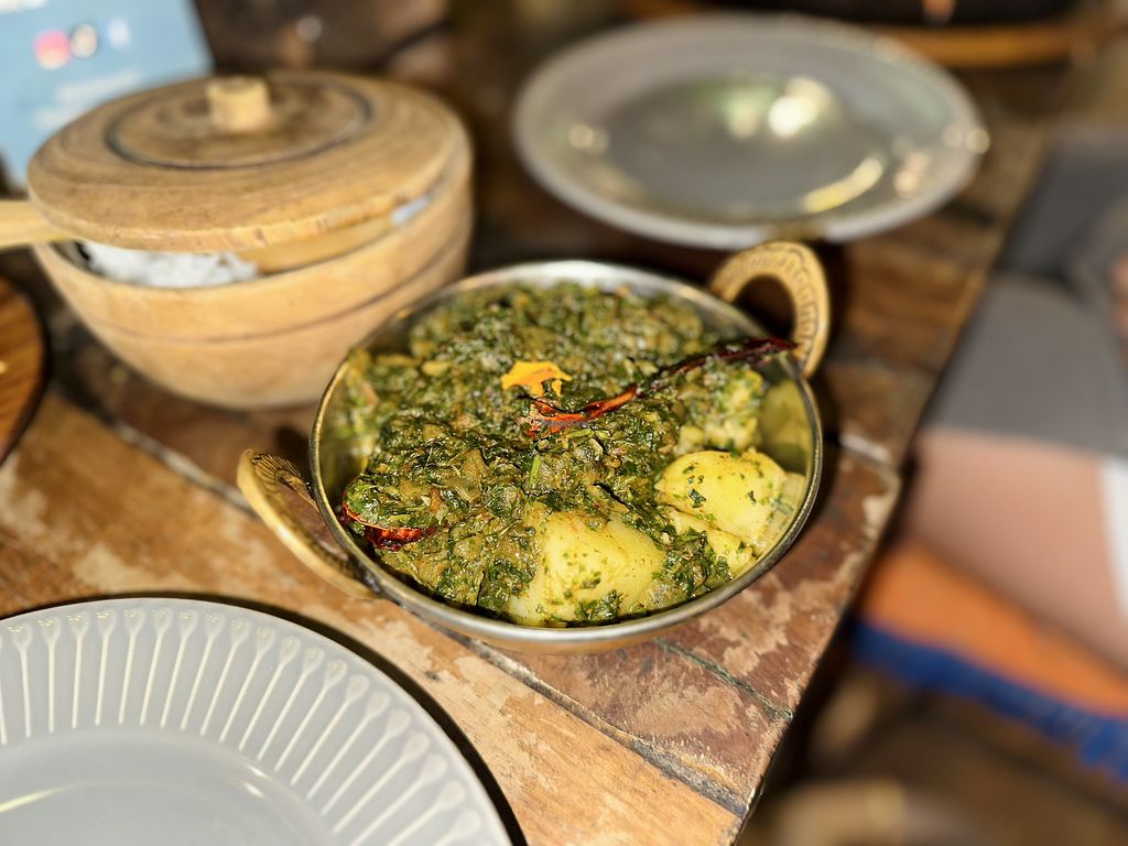 Saag aloo, jackfruit curry, chapattis, jackfruit pakora.
