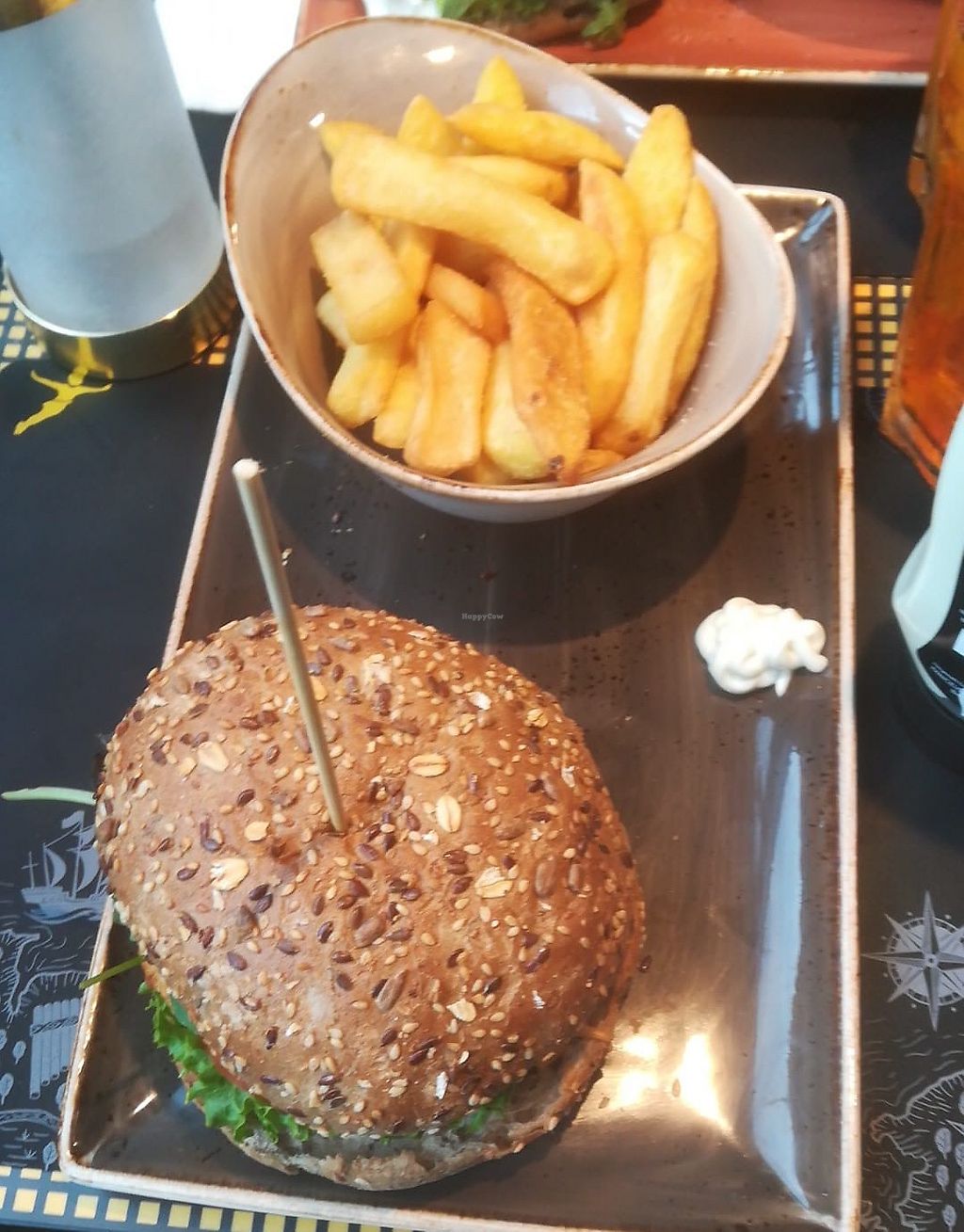 Serves meat, vegan options available. Bar and burger restaurant chain where the menu has a separate section for vegan food. Includes several kinds of burgers with or without buns, green salads, fries and sauces. Vegan dessert may be a chocolate pudding with coconut ice cream or vegan chocolate cake. Plant milk available for coffee. Open Mon-Sun 11:00-22:00.