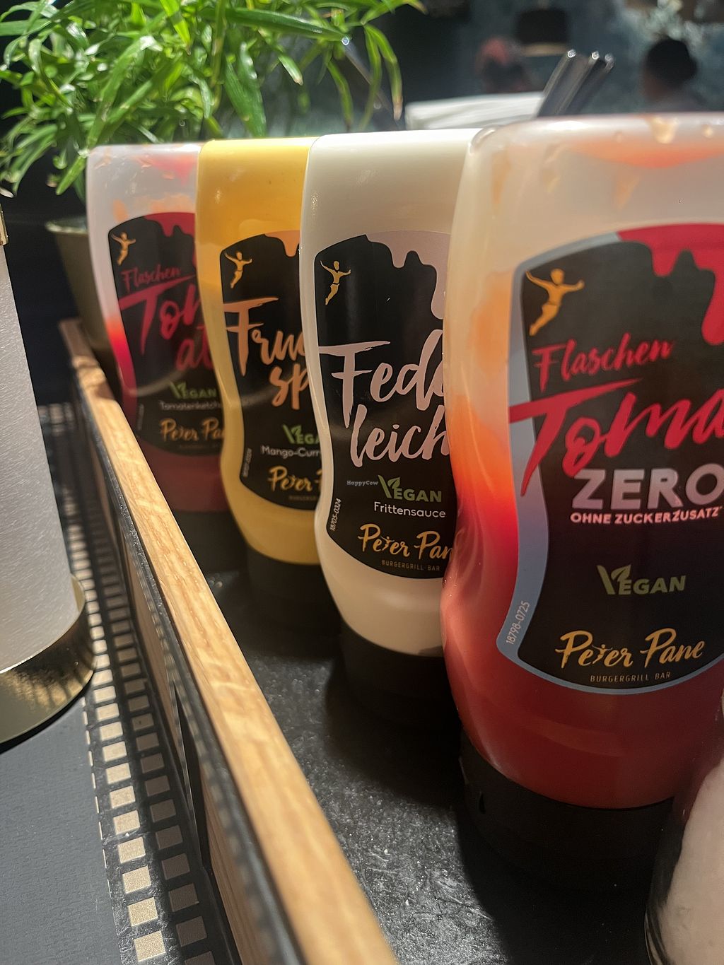 Der Burger und die Pommes waren sehr lecker. Auf dem Tisch stehen zusätzlich 3 vegane Soßen.