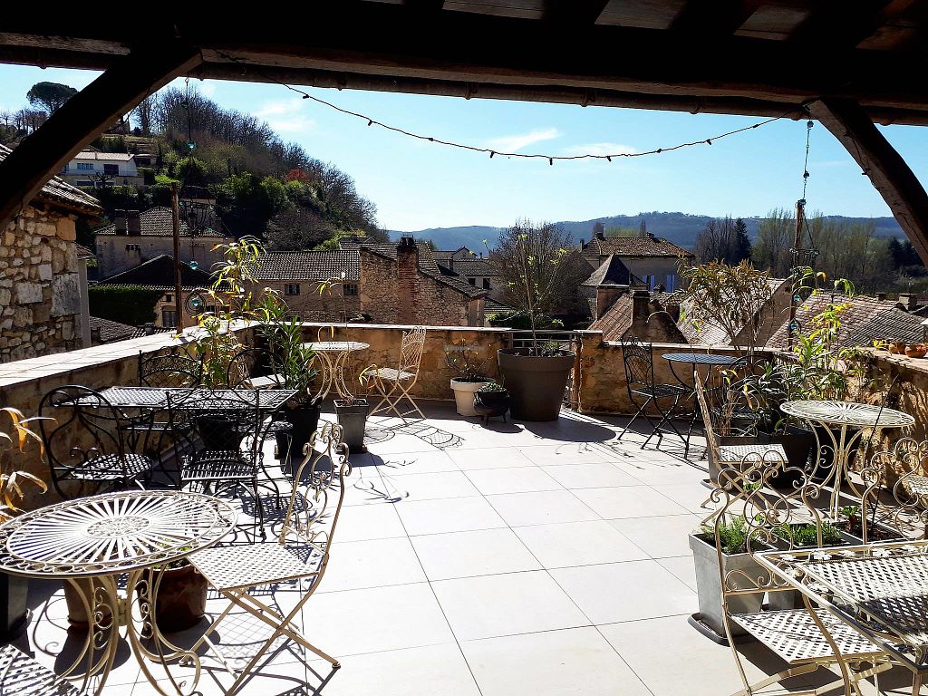 Serves fish, vegan options available. Offers local, organic vegetarian dishes. Vegan options available on request include salads with lots of different toppings. Offers views of the medieval town of Puy l'Evêque from the patio dining area. Reported to serve fish July 2023. Open Thu-Sun 10:30-18:30. Closed Mon-Tues.