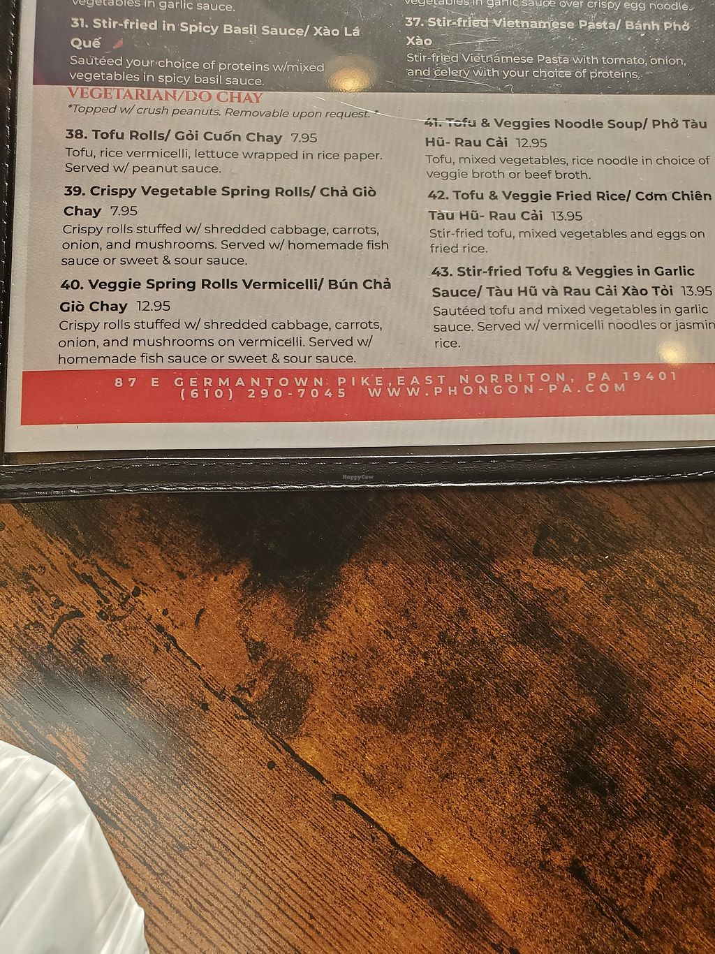 Serves meat, vegan options available. Vietnamese restaurant with a vegan menu section that includes pho, bun, fresh rolls, and several other tofu dishes. Specify vegan when ordering - may include tofu rolls, crispy vegetable spring rolls, vegetable spring rolls, tofu vegetable noodle soup, tofu & veggie rice, stir fried tofu & vegetables in garlic sauce. Open Mon-Thu 11:00am-9:00pm, Fri-Sun 10:30am-9:00pm.