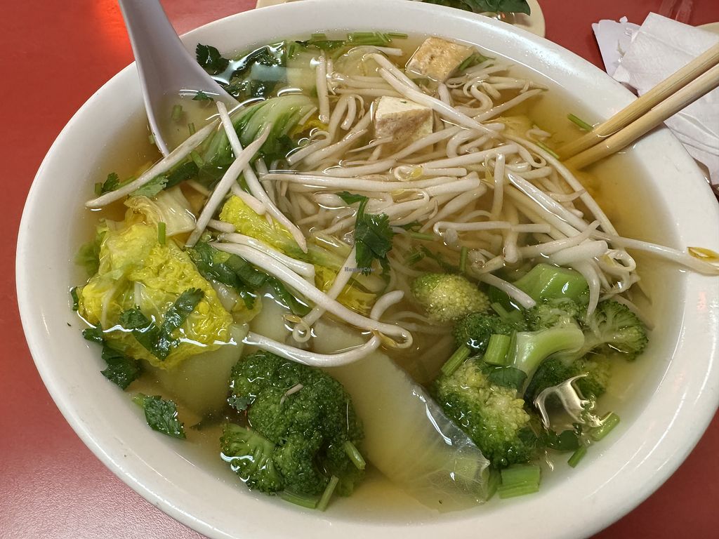 I love this place! They’re the first pho restaurant I ever went to and they set the bar high! You do have to specify veggie broth when ordering the veggie pho. It cones with fried tofu, broccoli, onion, cilantro, and baby bok Choi. The prices have slowly risen since I first started going here in 2013 and it’s so worth it! You can also get the summer rolls made with tofu. The staff is nice and the same people have been there the whole time. The woman who rings you up always remembers me, even when I haven’t been for over a year.