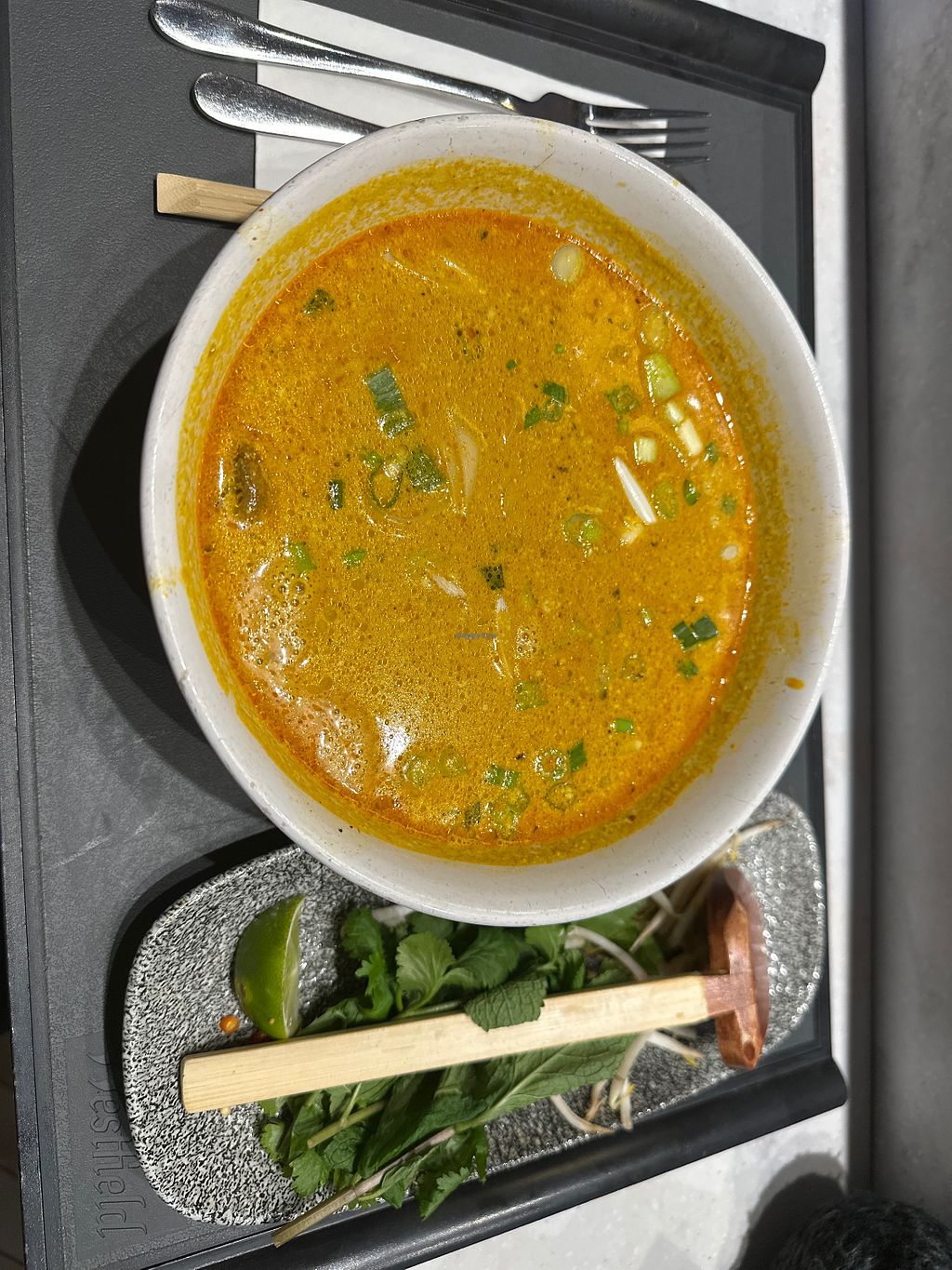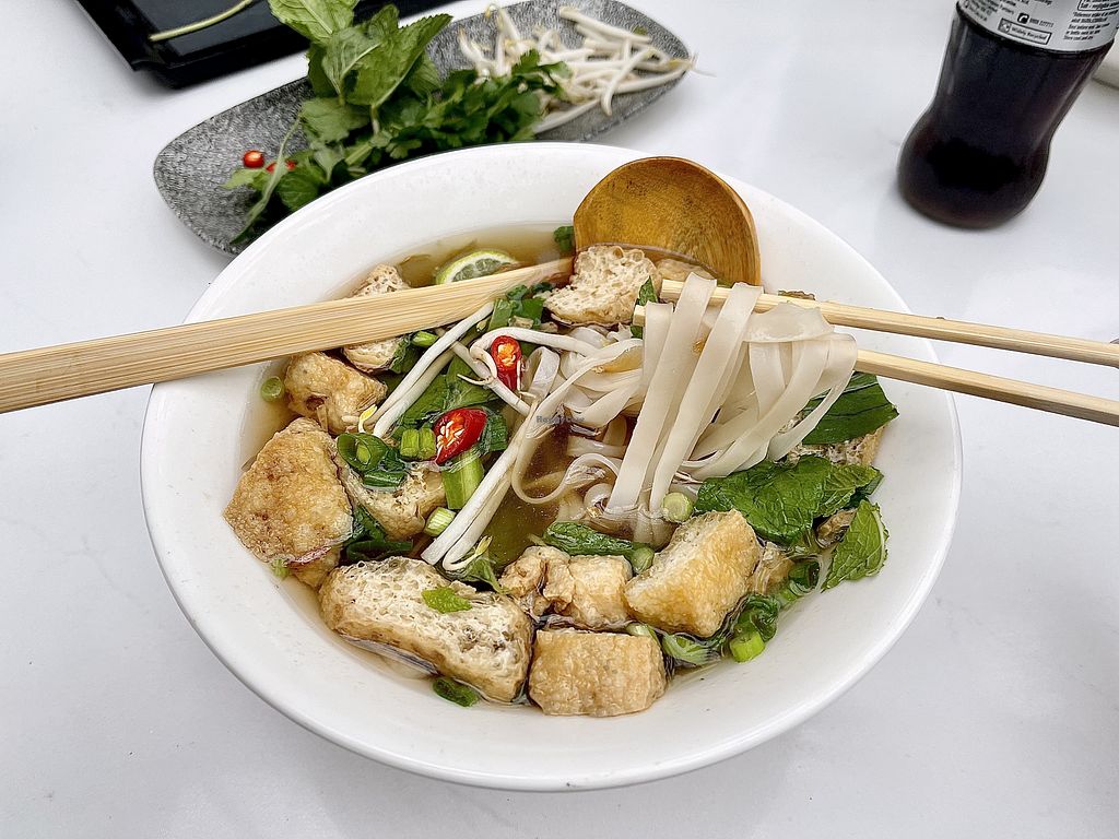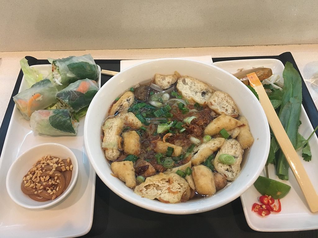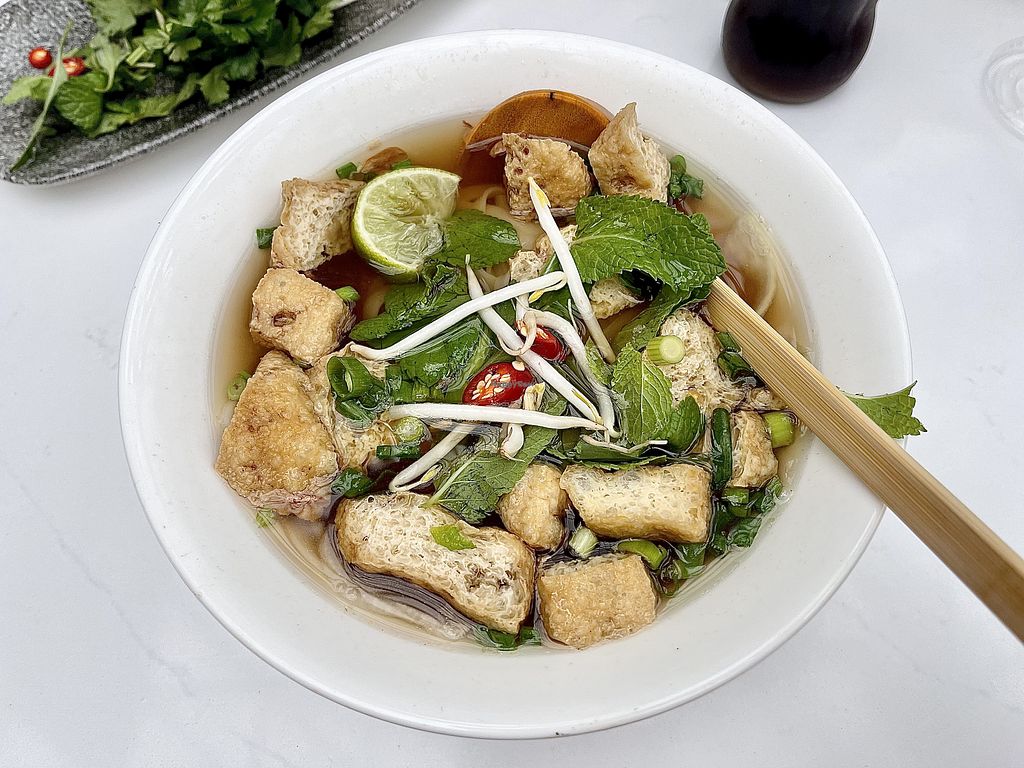 Tofu & button mushroom pho with veggie broth, and veggie summer rolls …