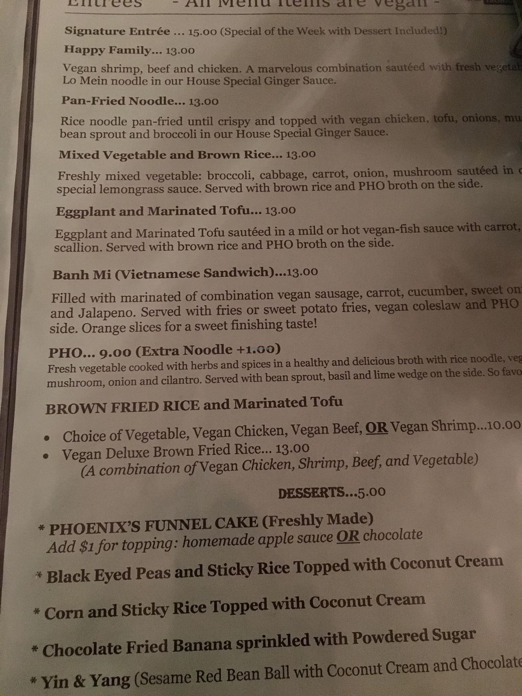 The owner is so sweet and kind! Her pho is great, the broth is very good. They have mock drumsticks and other mock meats. The yin yang sesame ball dessert is great and they have vegan funnel cake.