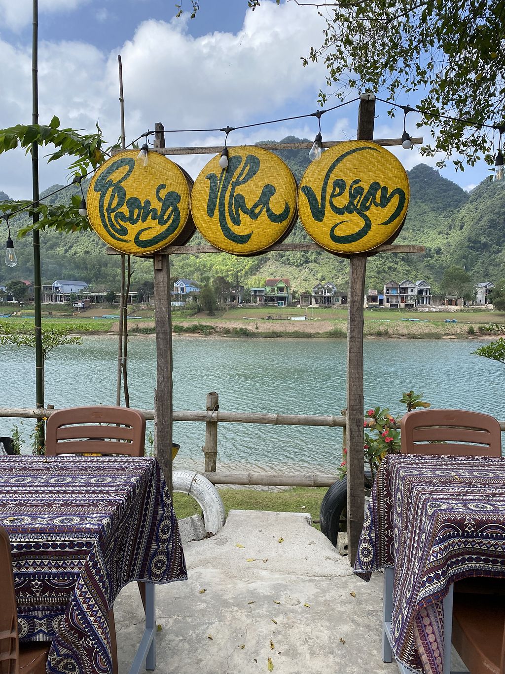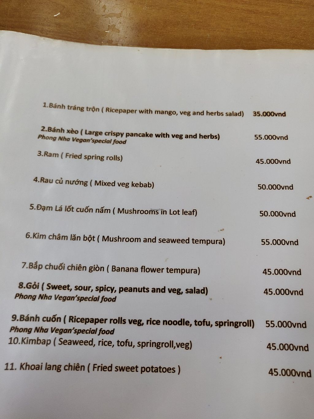 I got the phở, which had one small piece of fake meat in it. The rest was al vegetables, and there were very few fresh herbs. While it wasn’t expensive, the price was on the higher end for a bowl of phở, and I expected better. The staff are not very speedy either. The location next to the river is nice though, and they have a fair selection of dishes, with everything properly translated into English on the menu. There’s not much choice in Phong Nha, so this place scores points for being one of the very few clearly and specifically targeted for vegans.