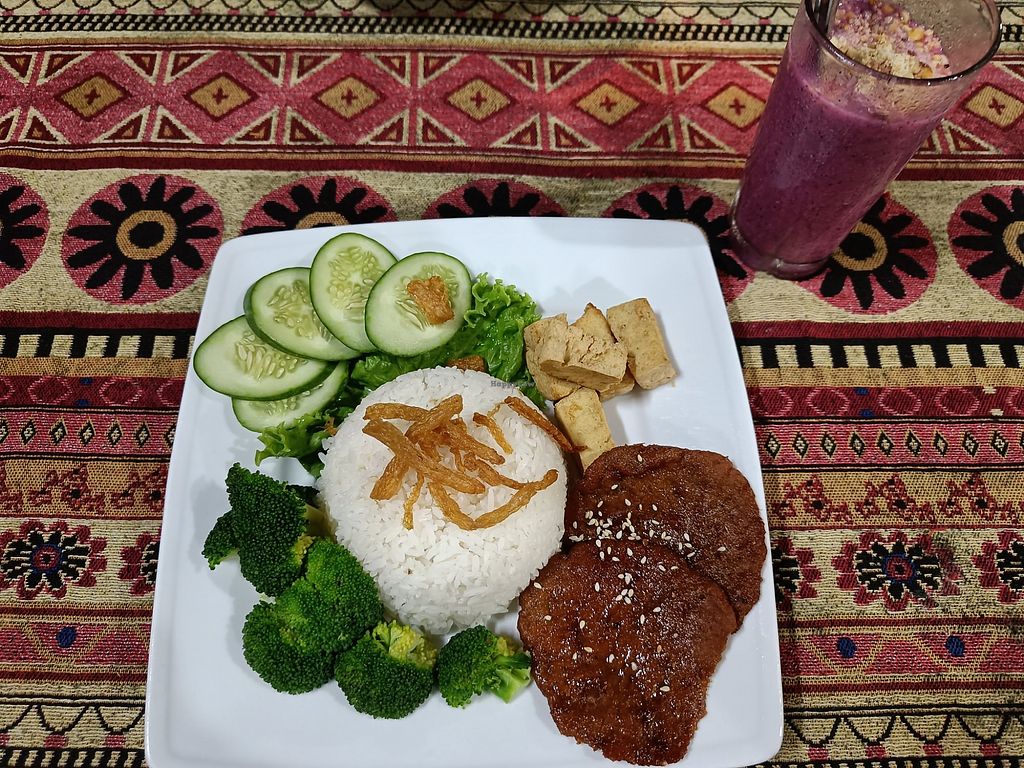 Aubergine and peanuts, rainbow veggies and vegan pork