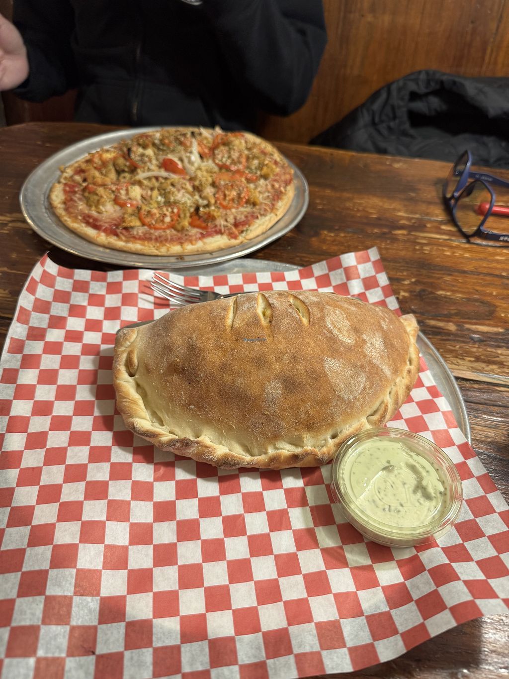 Vegan pizza. Tastes fantastic. Not the easiest accomplishment and these people got it right. Ordered a supreme calzone, had tons of shizzle on it, tasted fabulous. Caesar salad was completely yummy. It was our first time here, but I find it hard to believe you could go wrong ordering at this place.