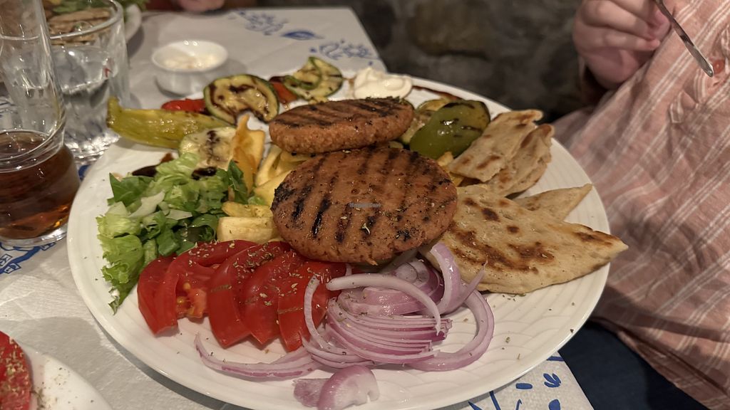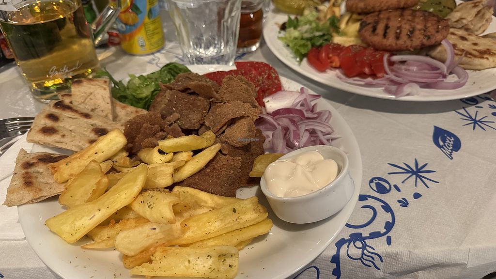 Vegan souvlaki on the left, gyro on the right and a side of French fri…