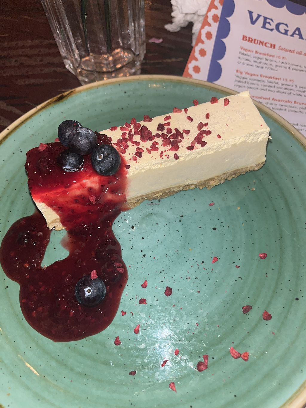 Warm atmosphere, a few nice vegan options. I had a vg moroccan aubergine flatbread with hummus and veggies. Partner had a big vegan breakfast. For dessert he had a slice of carrot cake, I had a really lovely semifreddo with berry compote.