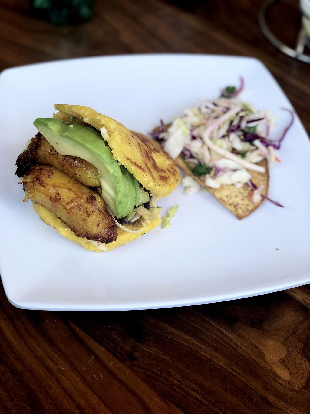 This is a sweet corn arepa with avocado, fried plantains, jicama, toma…