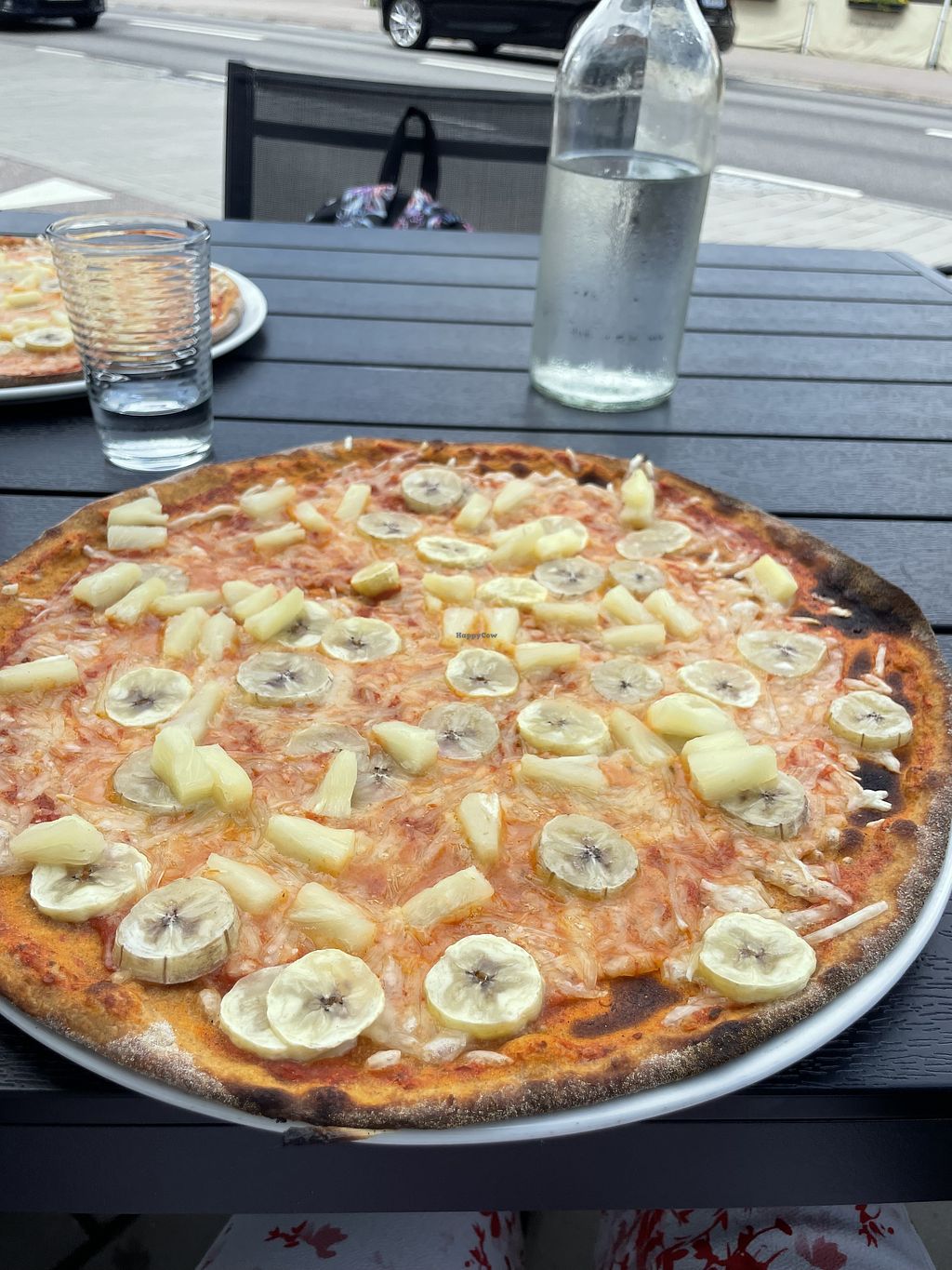 The optional vegan dough (standard pizzas had milk) was probably also the gluten free version, reminding us of a galette in taste, in the best meaning. Several vegan toppings as cheese and ham. Nice service.