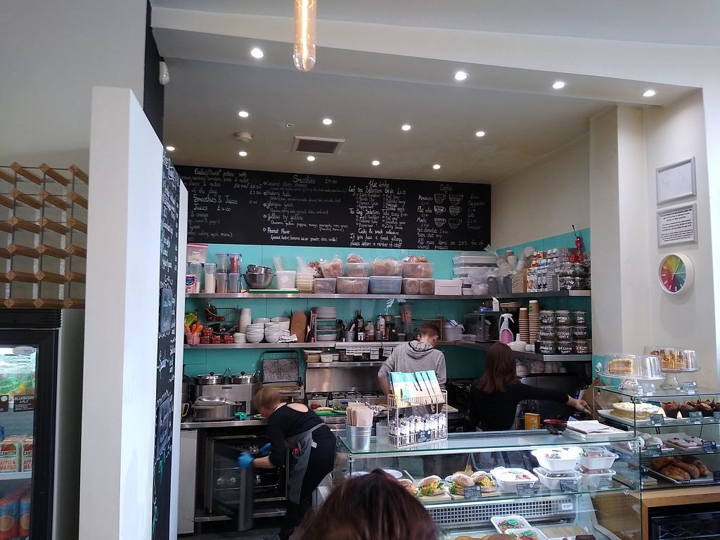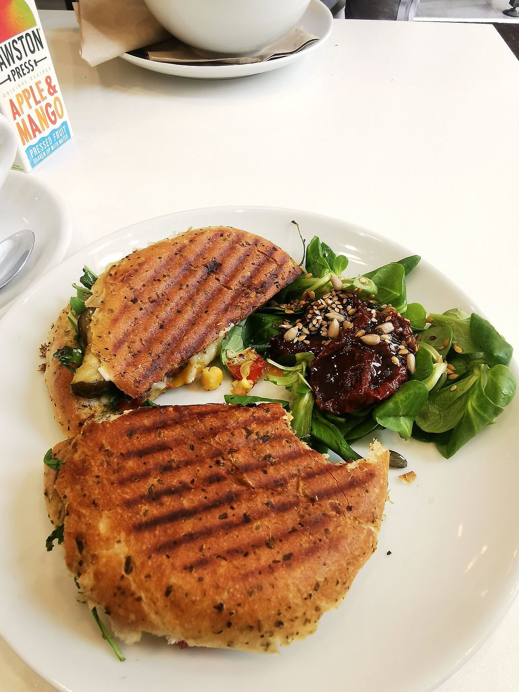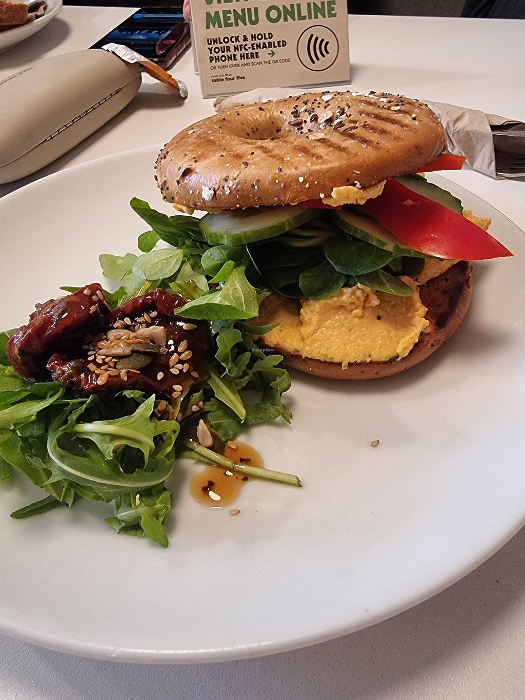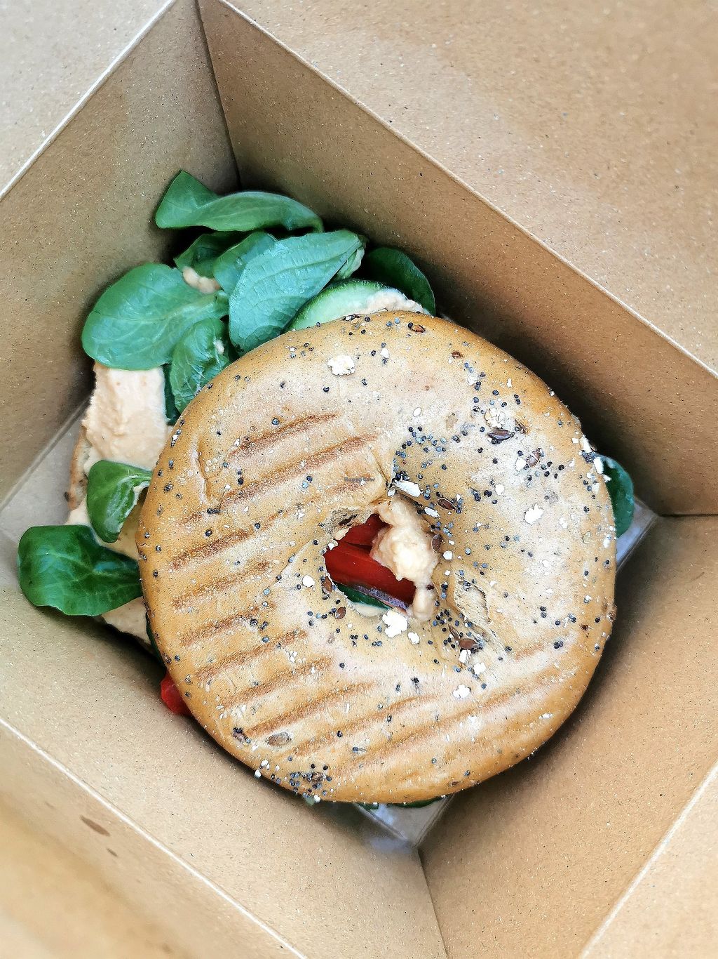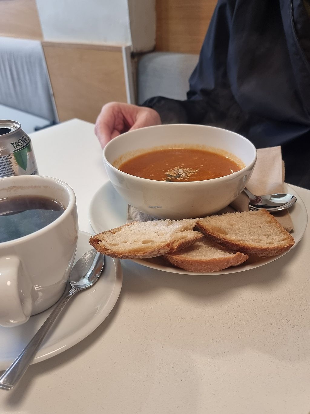 Cream cheese bagel, tomato & red pepper soup and a cappuccino with oat…
