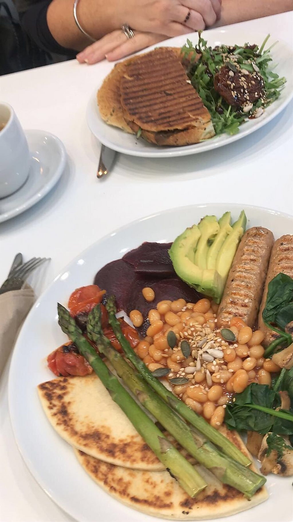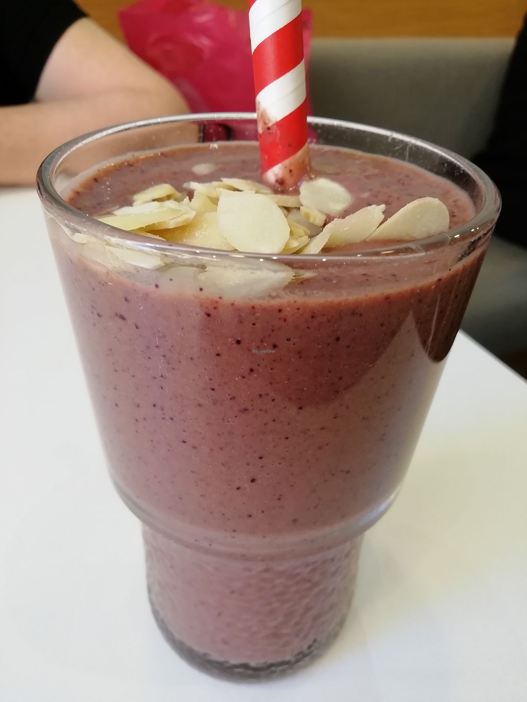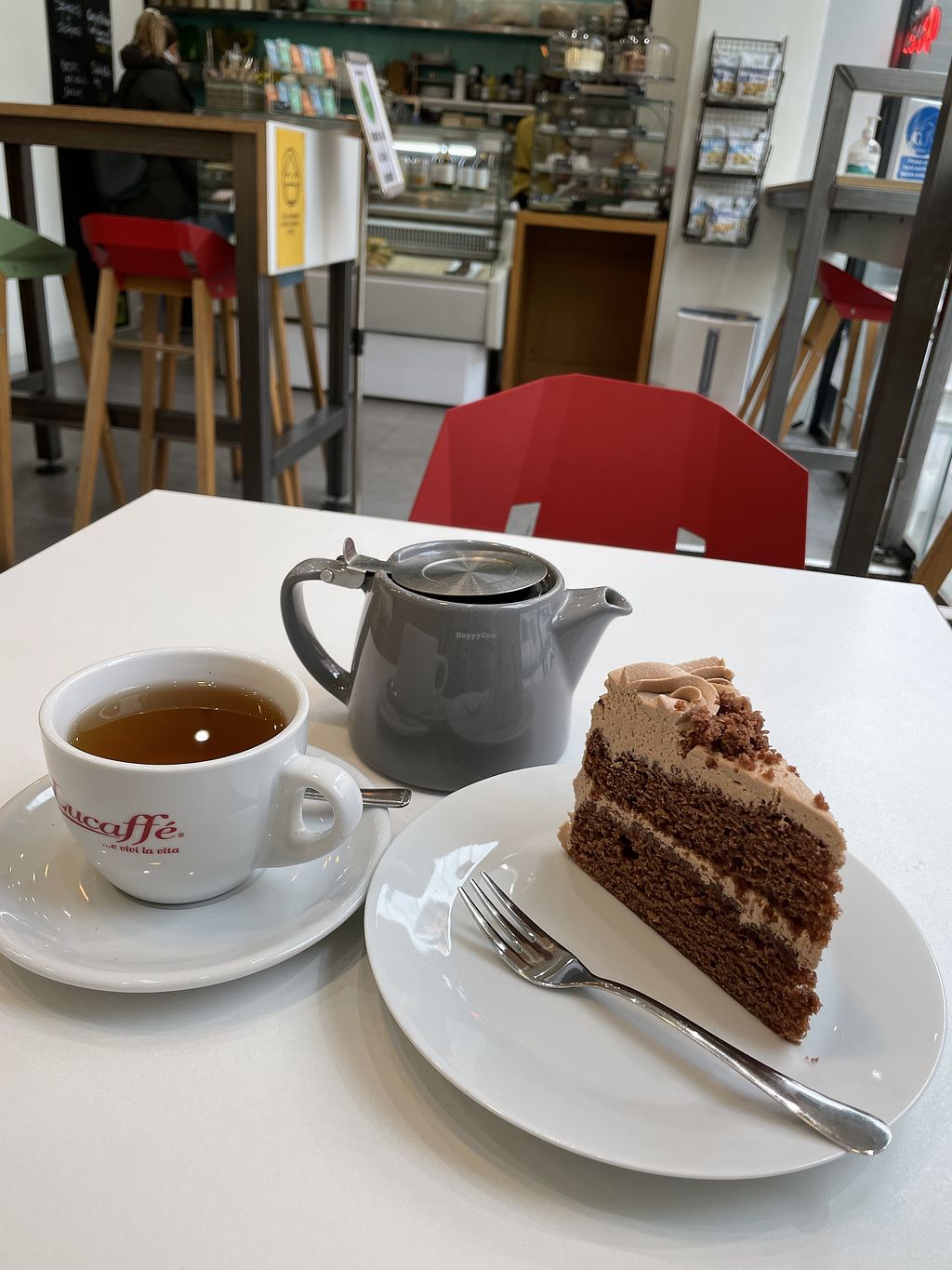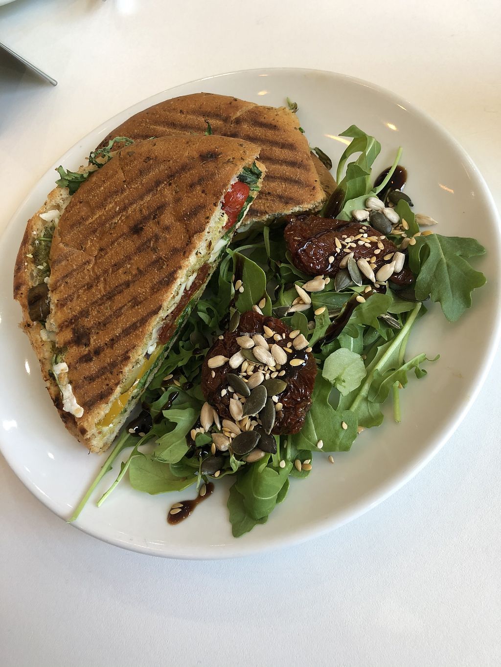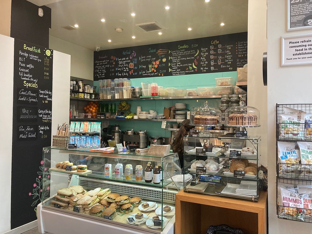 Cream cheese bagel, tomato & red pepper soup and a cappuccino with oat…
