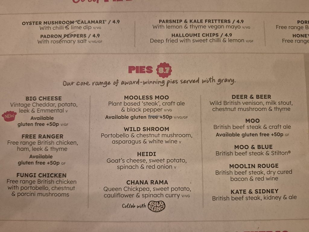 The majority of the menu is veggie/vegan. I had the Kevin pie as part of the mother earth meal option and it was delicious. Crispy pastry, creamy (VEGAN) mash, kale and parsnip fritter, peas. As a lactose intolerant vegan it's really nice to have clarity on items such as mash which have caused me (and my digestive system) issues before. Will be returning to make my way through the 4 remaining vegan pies.