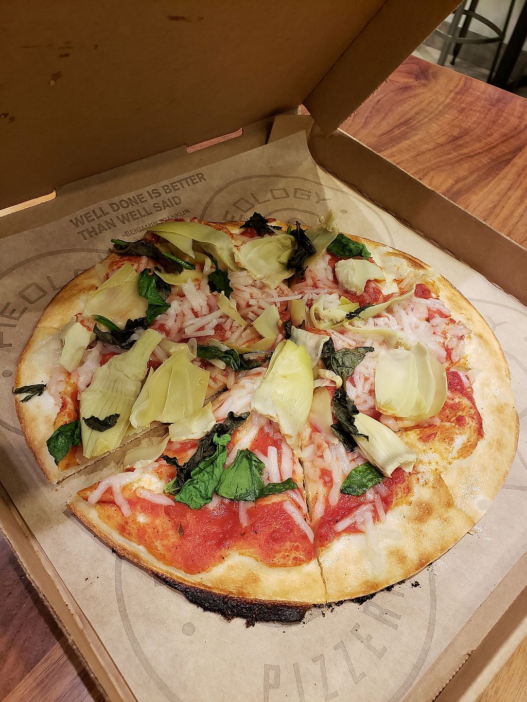 The thin crust & tomato sauce was delicious. The brick oven made it even better. We just needed a light dinner. The pizzas are about 10 inches, so one was perfect to share. If we were actually hungry, we would have gotten two to be satisfied. They also have an ICEE machine!