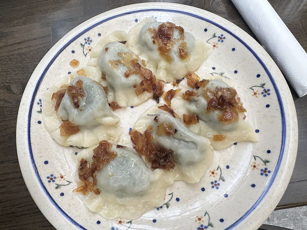 Serves meat, vegan options available. Polish pierogi with vegan options that include sweet and savory pierogi. Also has stuffed cabbage. Open Tue-Sun 12:00pm-8:00pm. Closed Mon.
