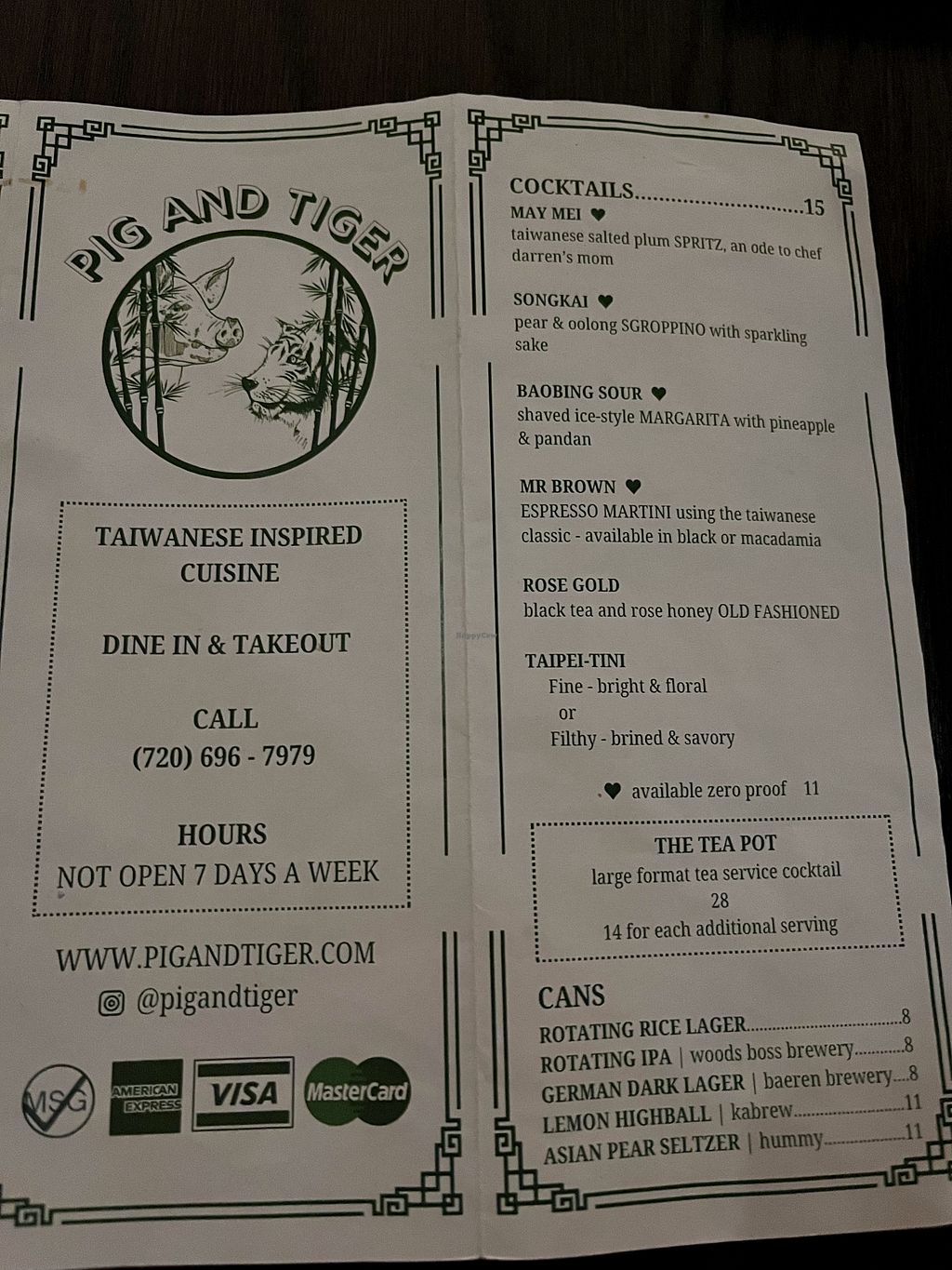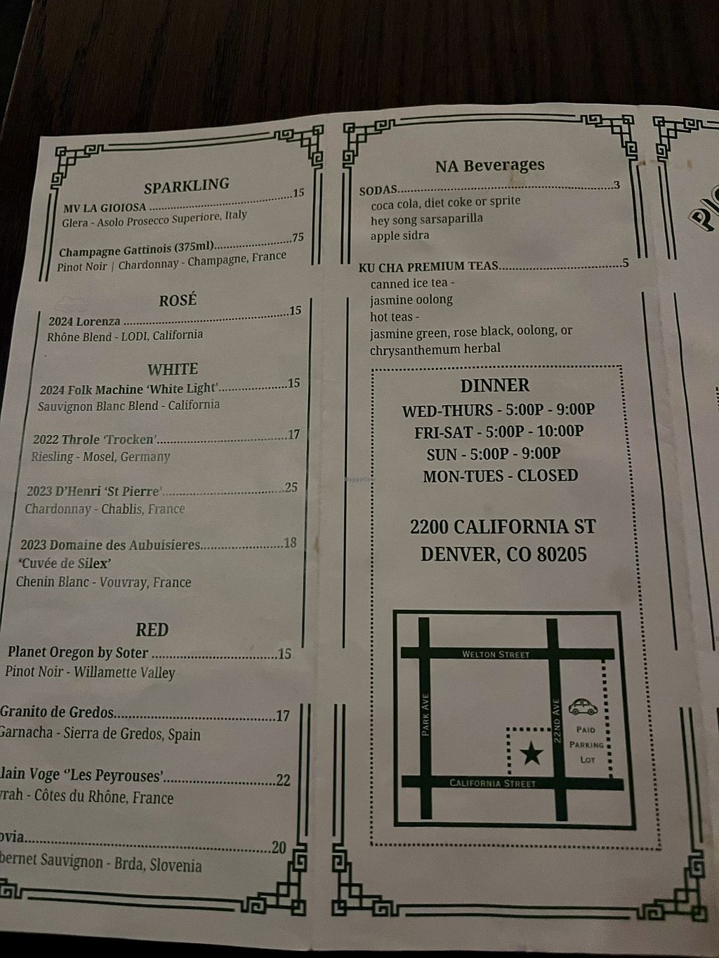 Serves meat, vegan options available. An upscale restaurant in the Five Points neighborhood of Denver serving Taiwanese-inspired dishes. , Mapo tofu, dumplings, sesame noodles, jade noodles, and appetizers like broccoli and sichuan potatoes Open Mon 5:00pm-9:00pm, Wed 5:00am-9:00am, Thu-Fri 5:00pm-9:00pm, Sat-Sun 5:00pm-10:00pm.