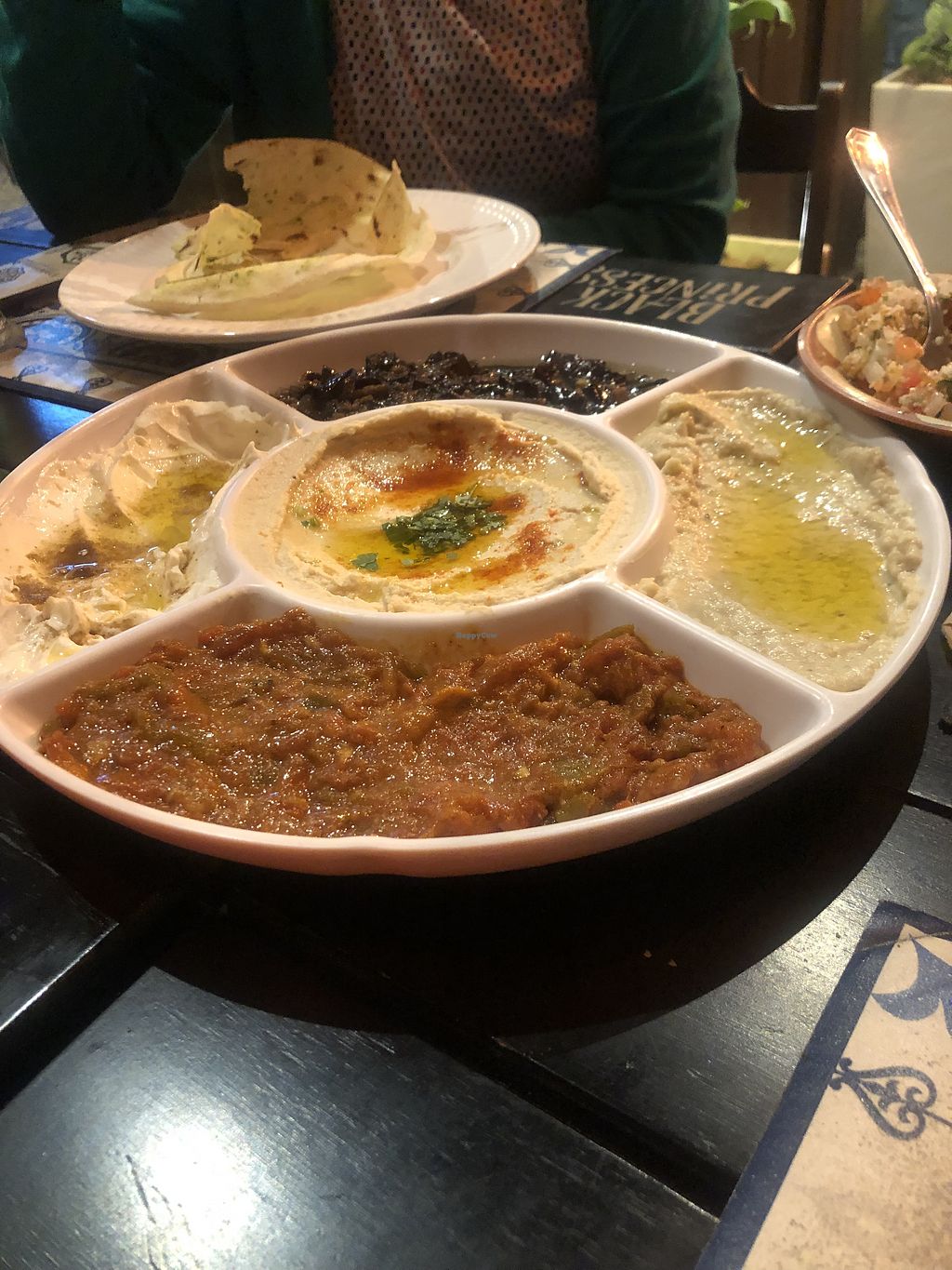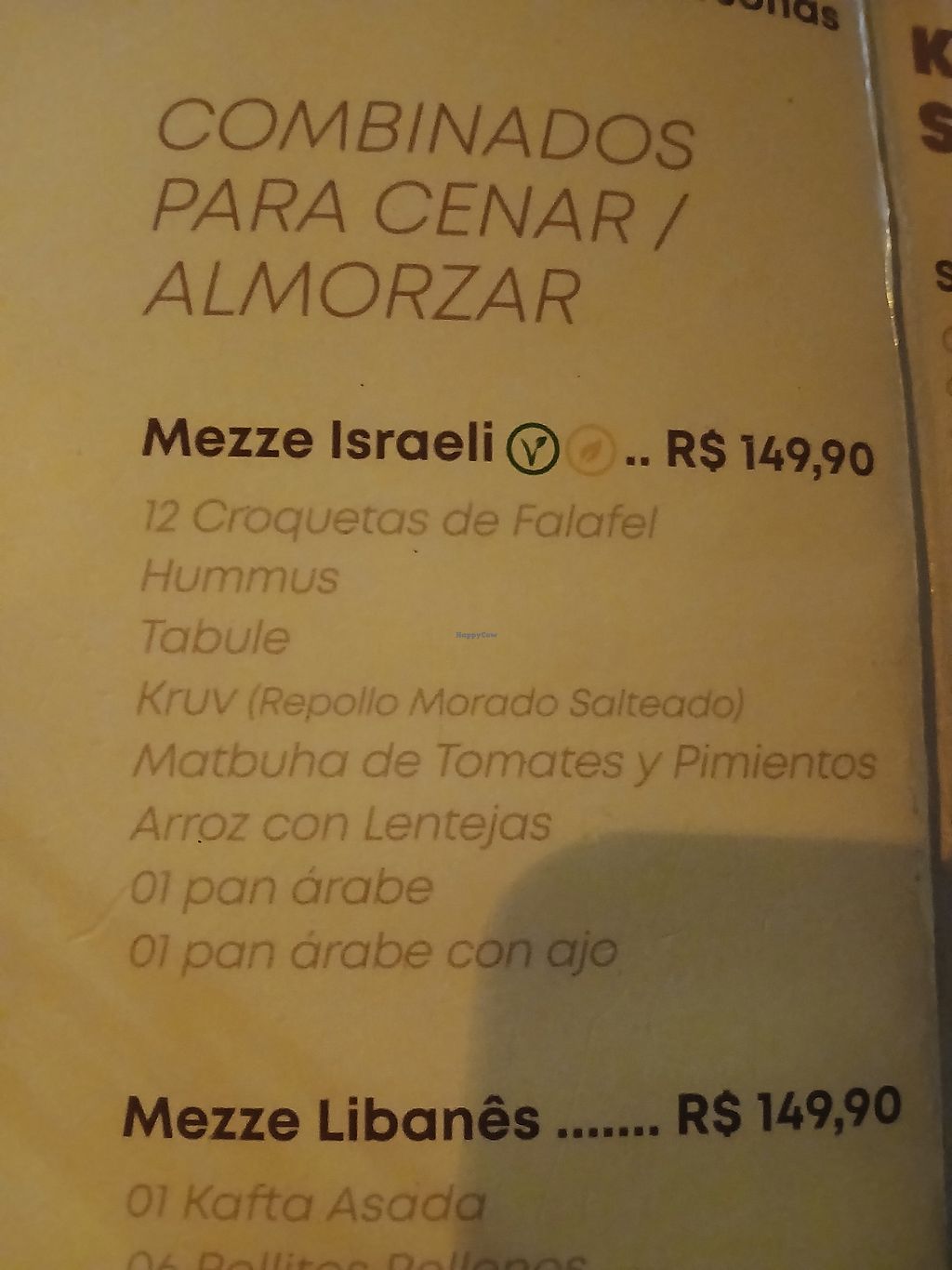 Pedimos la opcion vegana mezze israeli para cenar,es para dos personas,por un valor de 150 reales, mas bebida y propina, total 190 reales ambos. No me deja la app poner 5 estrellas por que es para lugares veganos o vegetarianos exclusivamente,por eso puse 4. La comida estuvo riquisima, muy sabrosa y diferente. El lugar es muy agradable. Buena atencion y rapidez. Eran varias preparaciones : hummus, arroz con cebolla y lentejas, pan arabe, una preparacion con repollo, una salsa de tomate, falafel y tabule.