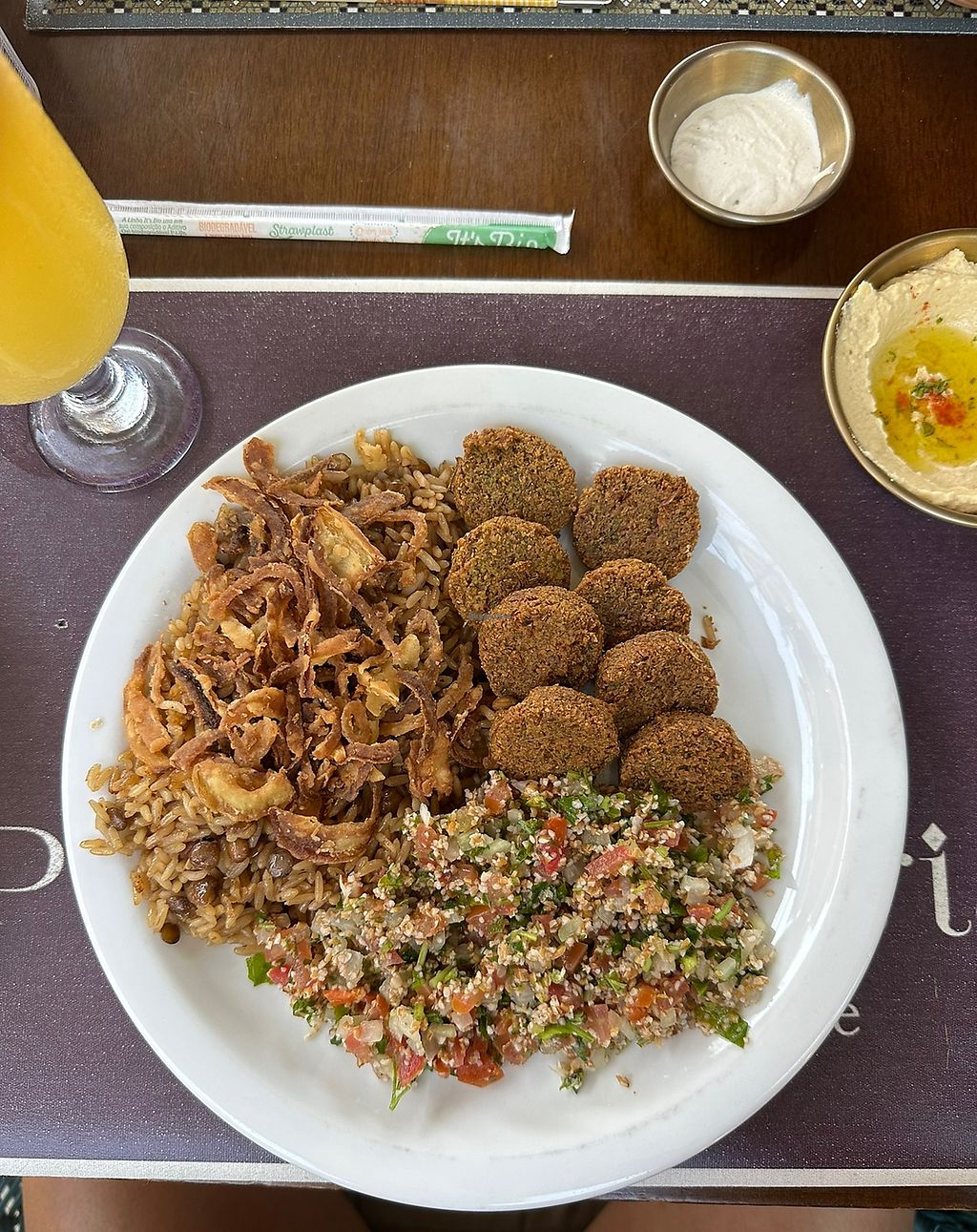 plato de arroz con lentejas acompañado de croquetas de falafel y ensalada 🥗 con una salsa de garbanzos muy buena y jugo natural buenas opciones veganas