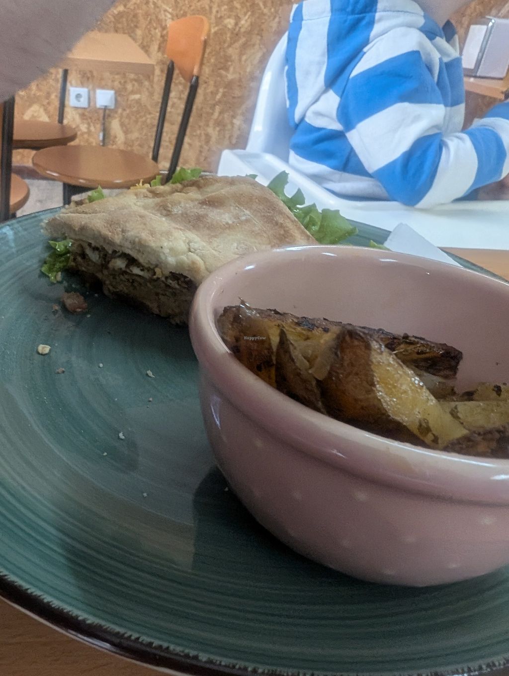 We were nearby and decided to drive here. Great decision! I had the menu of the day with courgette soup, a main dish of rice with tofu, peppers and curry and a melon and orange juice. I also had a sausage, vegan cheese and dried tomato pastry. My partner had the vegetables quiche, all delicious! It calls itself vegetarian but many options are vegan or can be made vegan 🙂
