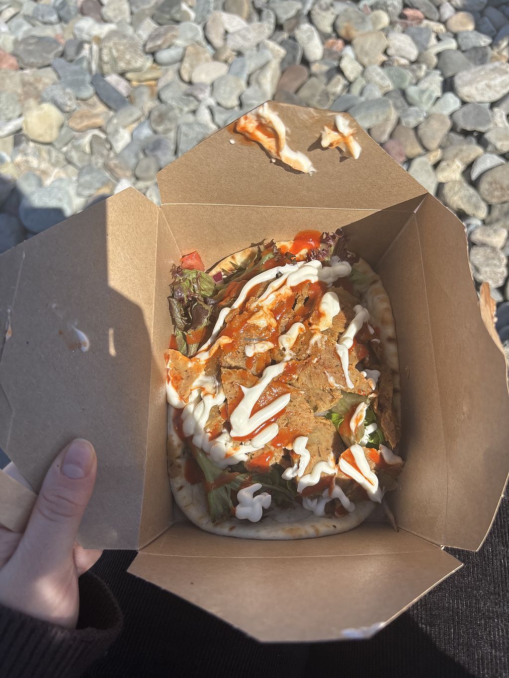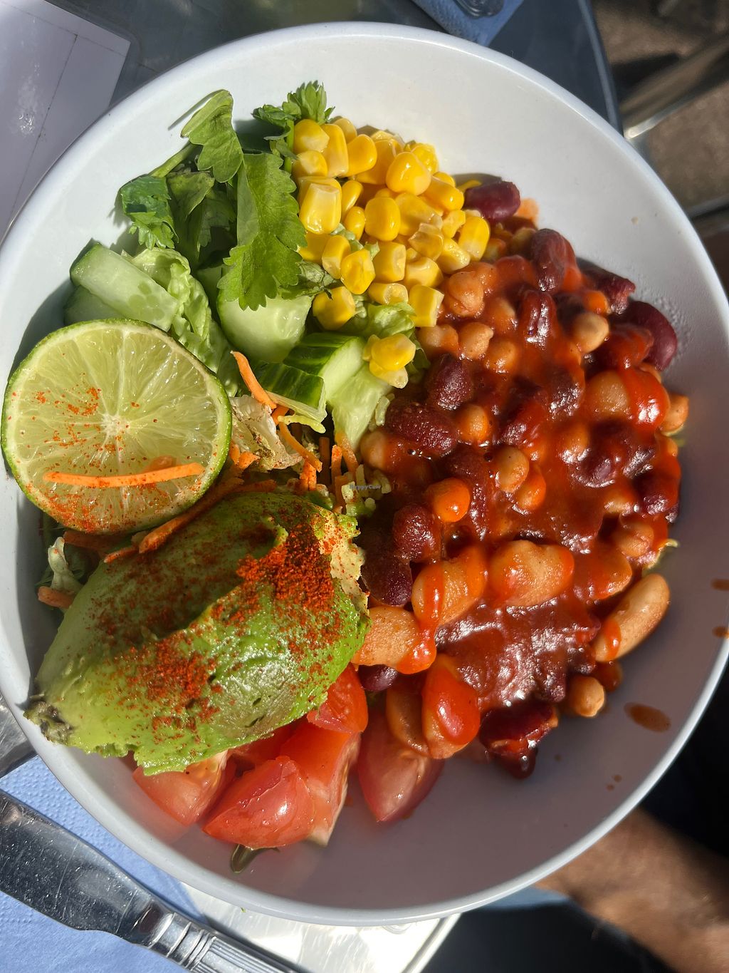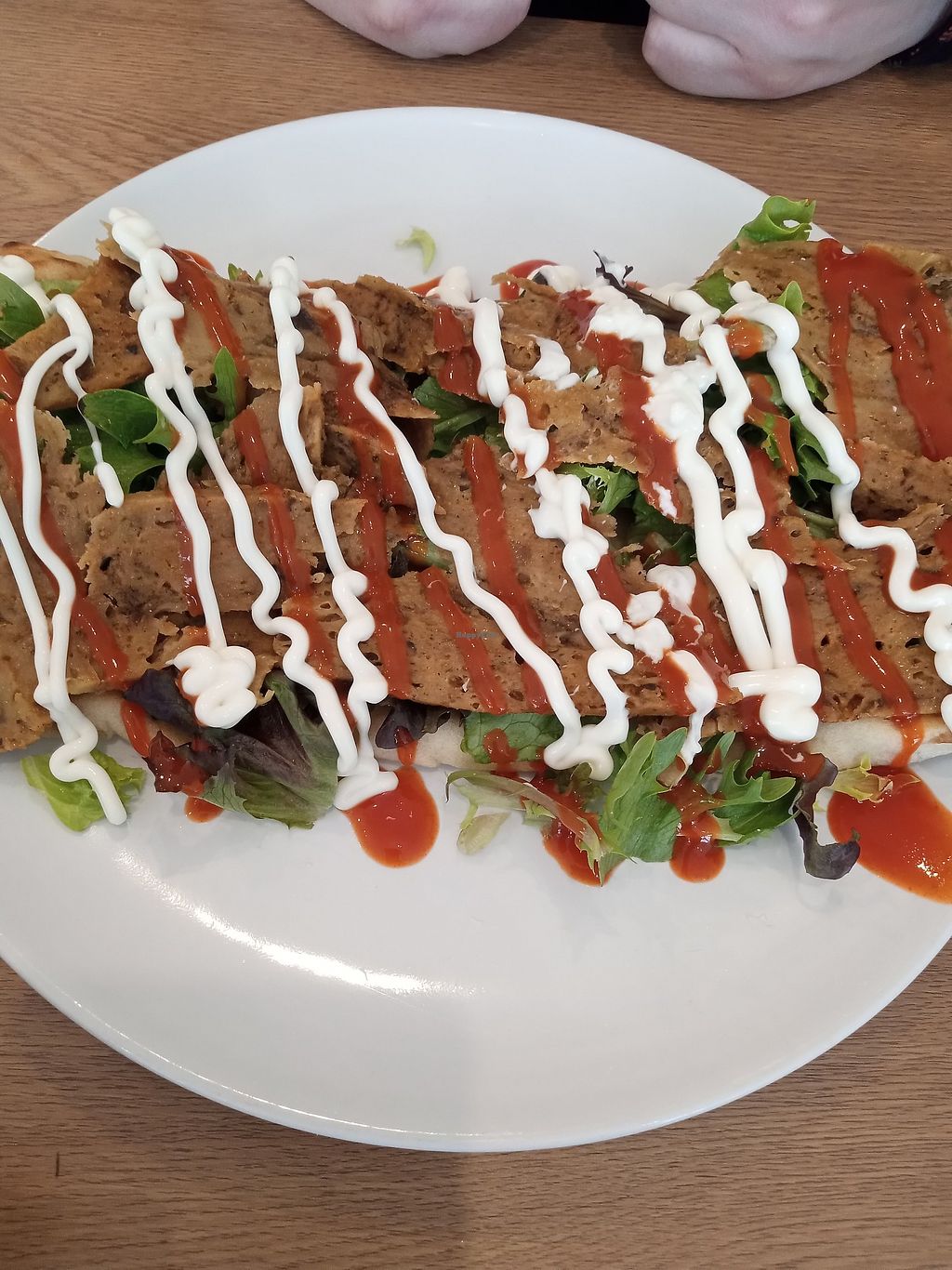 This is my favourite place we ate during our holiday to wales😄lots of options to choose from and food was quick! We sat outside as it was nice and sunny and people watched. We had the Mezze plate, burrito bowl and kebab followed by 2x biscoff cakes and a slice of mocha cake. The food was fresh and full of flavour and not oily/greasy, cake was fluffy and soft. Would 100% recommend and will be back! It was dog friendly too so our dog sat outside with us.