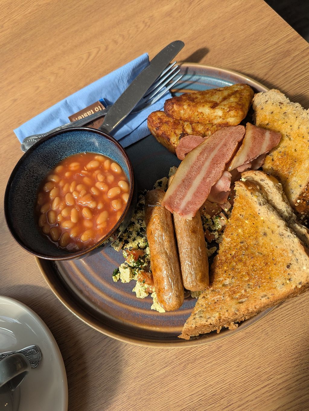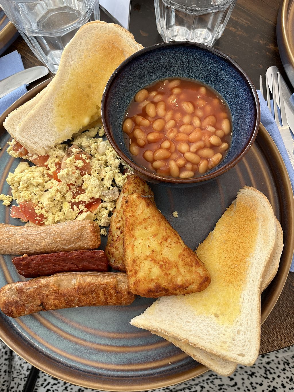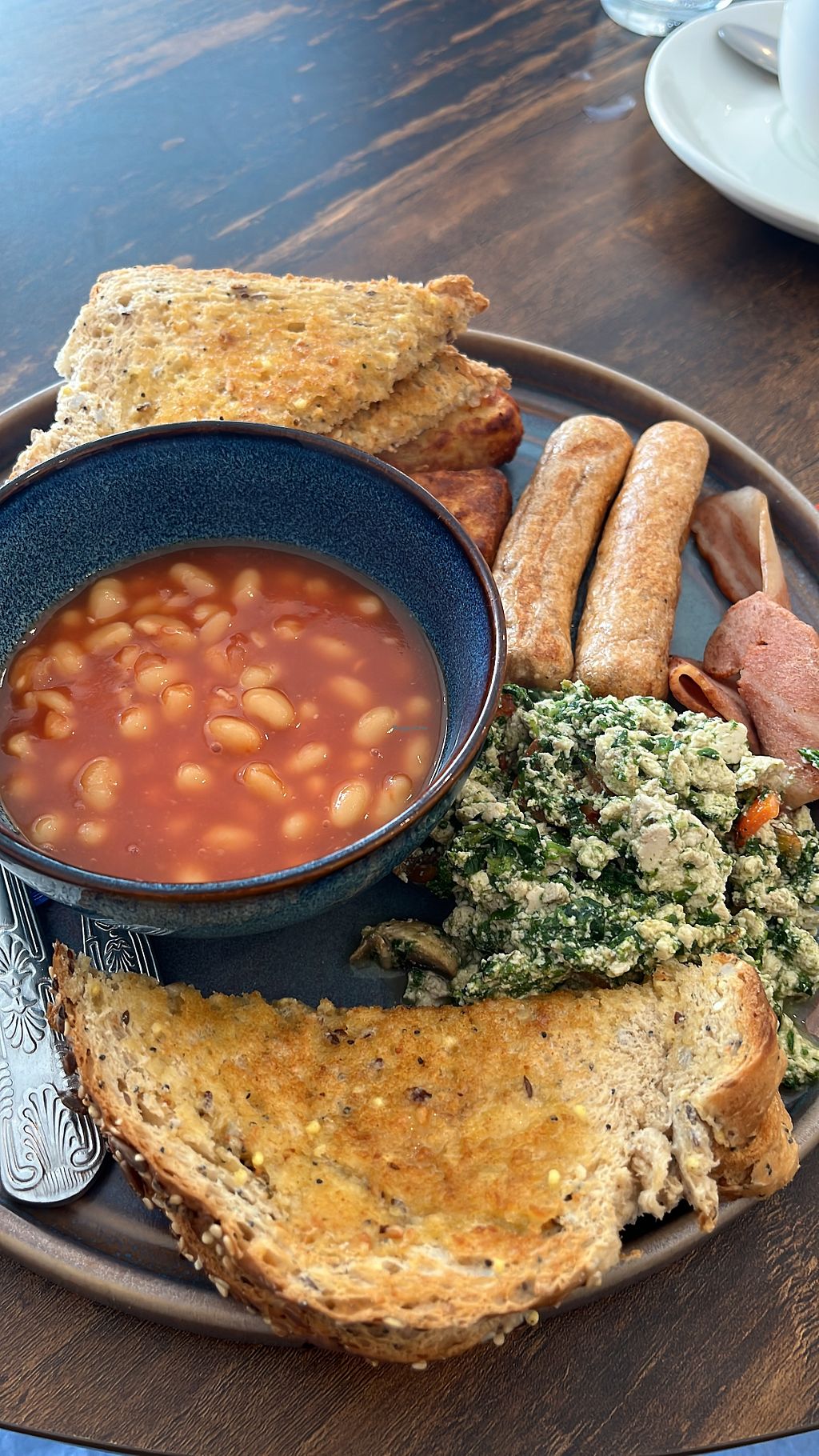 thankyou for your review, glad you enjoyed the food, we do serve half a tin of beans (200g) with each breakfast, we feel this is ample portion for one person along with 2 sausages, 2 hash browns, 2 slices of toast, scrambled tofu and vegan bacon, im shocked you would say this is a small portion and our prices compared to other vegan breakfasts around are very reasonable, next time please ask for more beans we would be happy to accommodate, as for the cake being dry😒if you had mentioned this we would of refunded or gave you a replacement cake no problem 🩵
