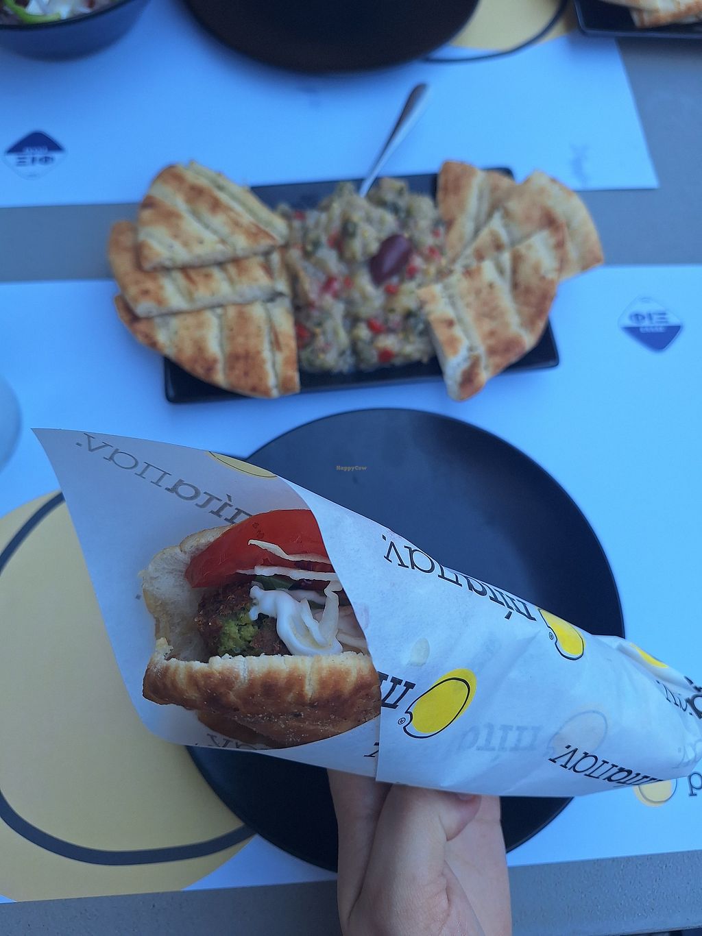 Mediterranean Fast food Beer/Wine Take-out Catering Greek Non-veg Serves meat, vegan options available. Greek restaurant specializing in pitas. Vegan options include a falafel pita with vegan mayonnaise, eggplant salad, and fries. Open Mon-Sun 12:00pm-12:00am. More