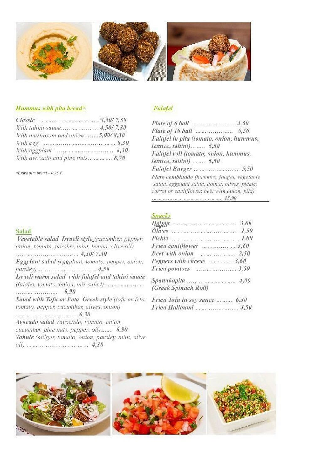 Tried the hummus and the vegetable salad. The salad was good, but a littlw overprized with its size. Unfortunately I didn't like the hummus at all. No salt, very oily and mainly tahin taste. The service was okay but not very good either, they had problems to understand our spanish and our english as well.
