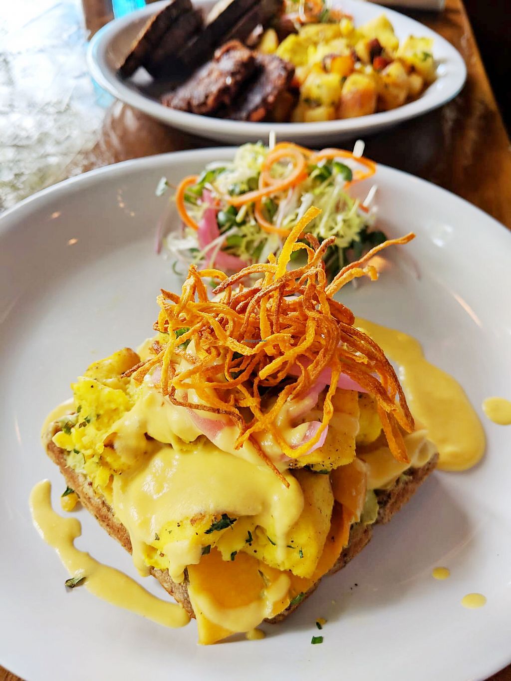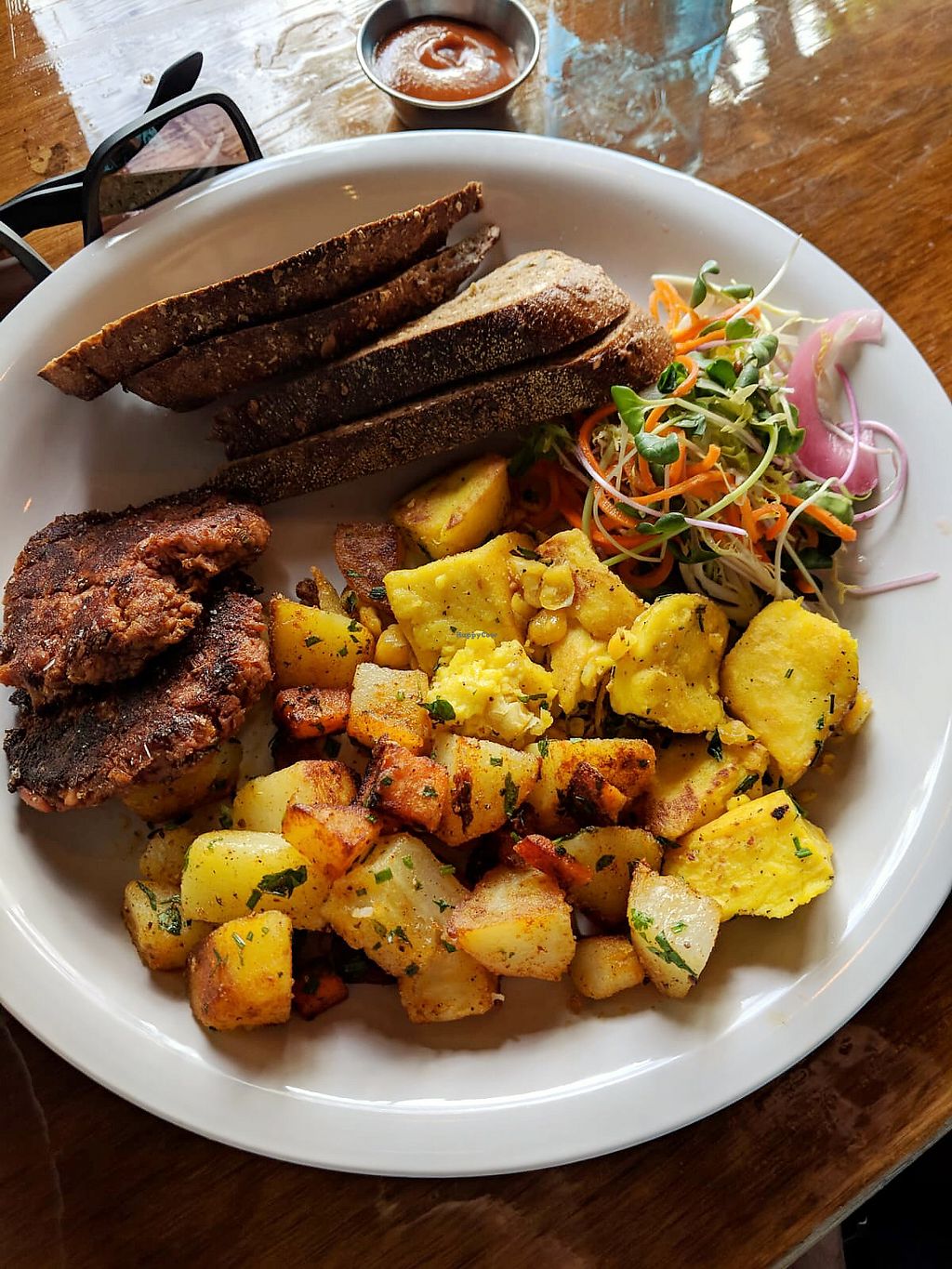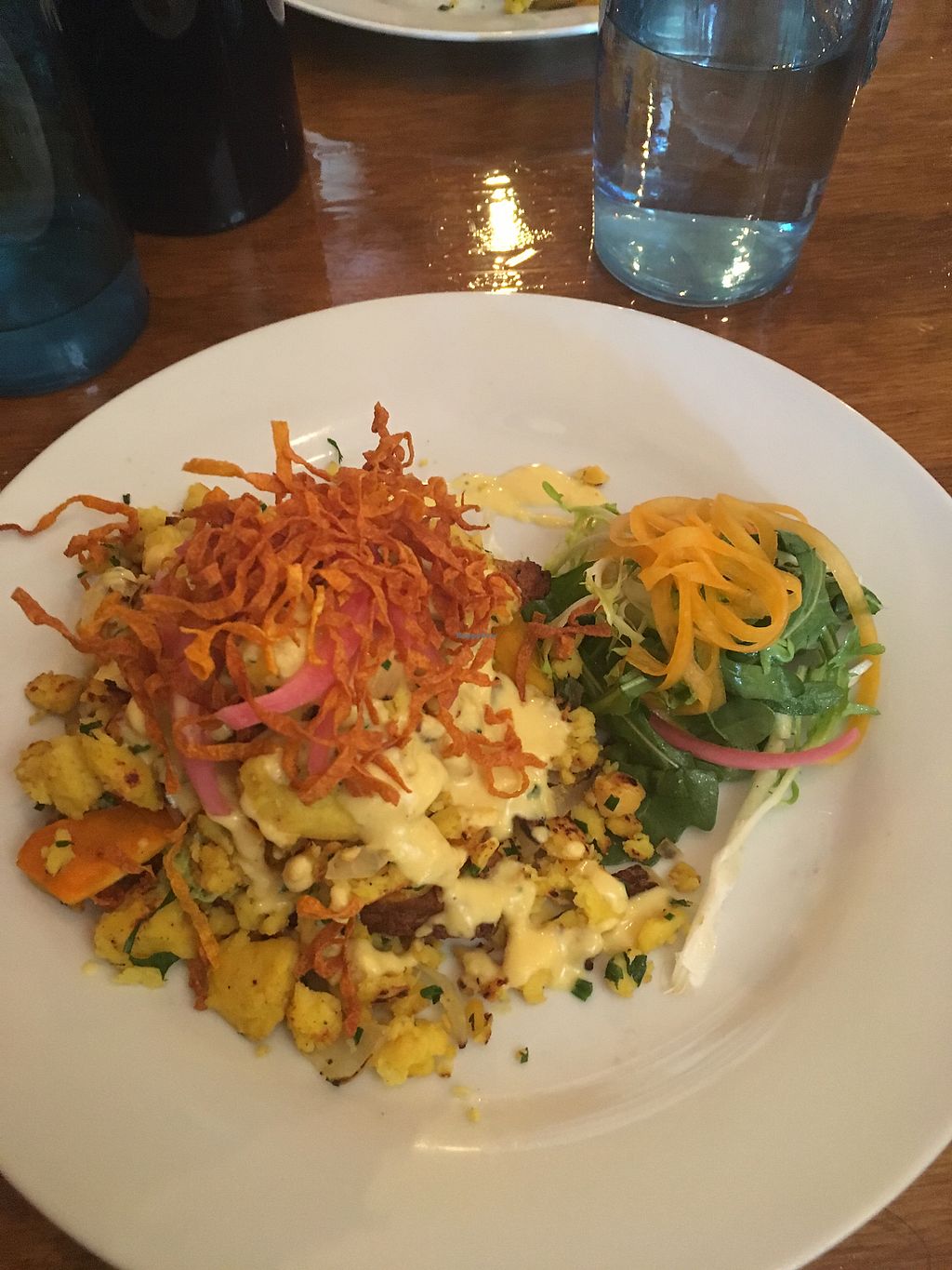 We decided to try Pitchfork our for brunch one Saturday. The place looks and feels like a cosy lake cabin with a great window spot for people watching. We ordered the Leggo my Eggo and The Basic, and were told that pretty much everything on the menu could be veganized. Cool! Both dishes came with this amazing fluffy chickpea scramble, which I tried for the first time. I don’t know what magic they used, but it tasted a whole lot better than so many egg dishes I’ve had in the past! Couldn’t get enough of it, and we’ll certainly be back for more! The hash was also really good, as well as the sausage, although a bit on the spicy end. We were told that all dessert is vegan, and although they were sold out by the time we got there, they usually have some interesting ice creams available. We’re going to go back to check out the dinner menu, and will be bringing friends by for brunch again real soon!
