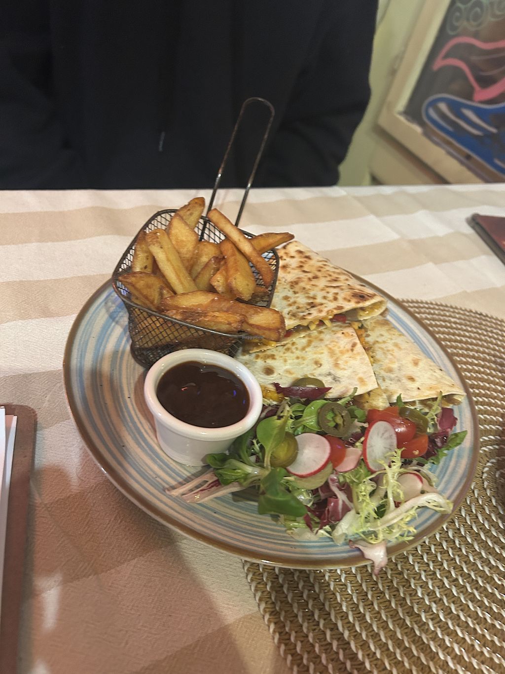 Read moreDieses Bistro war unsere zweite Wahl, weil ein anderes Lokal schon geschlossen hatte. Ich bin im Nachhinein sehr froh, hier gelandet zu sein. Ich habe das erste Mal überhaupt Quesadillas gegessen und muss sagen: ich habe mich ein bisschen verliebt (auch in die Mayo). Die Bedienung ist sehr freundlich und auf Nachfrage bekam ich auch noch eine sehr leckere Guacamole. Mein Freund bestellte sich ein omnivores Gericht, bei dem ihmzufolge zu viel Fleisch dabei war. Also: bestellt vegane Optionen ;)