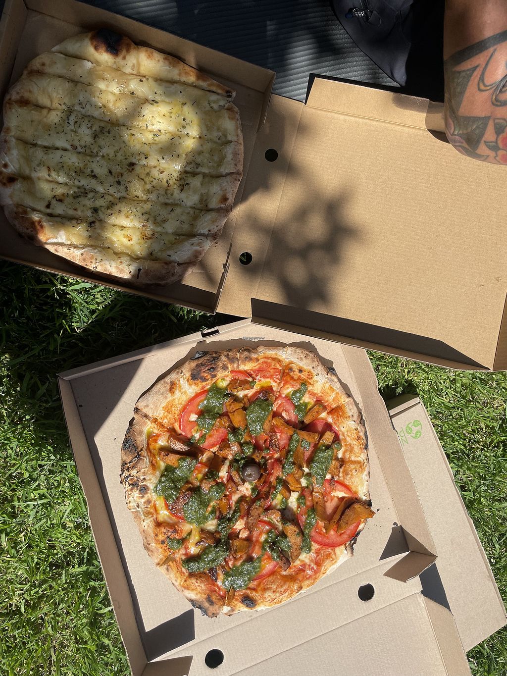Cheesy garlic sticks (actually like a smaller pizza) and seitan pesto …