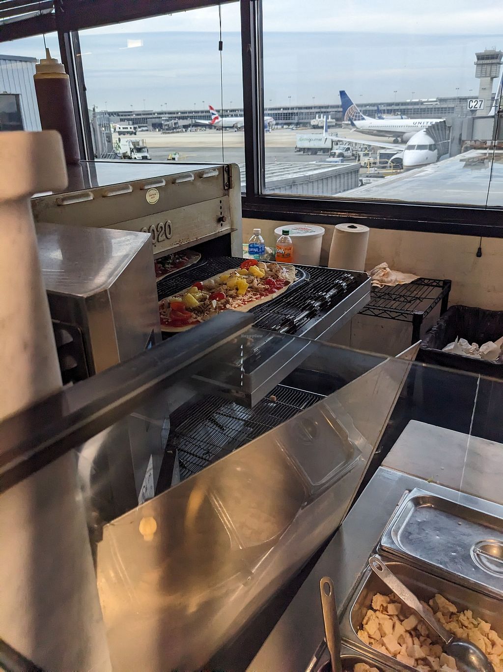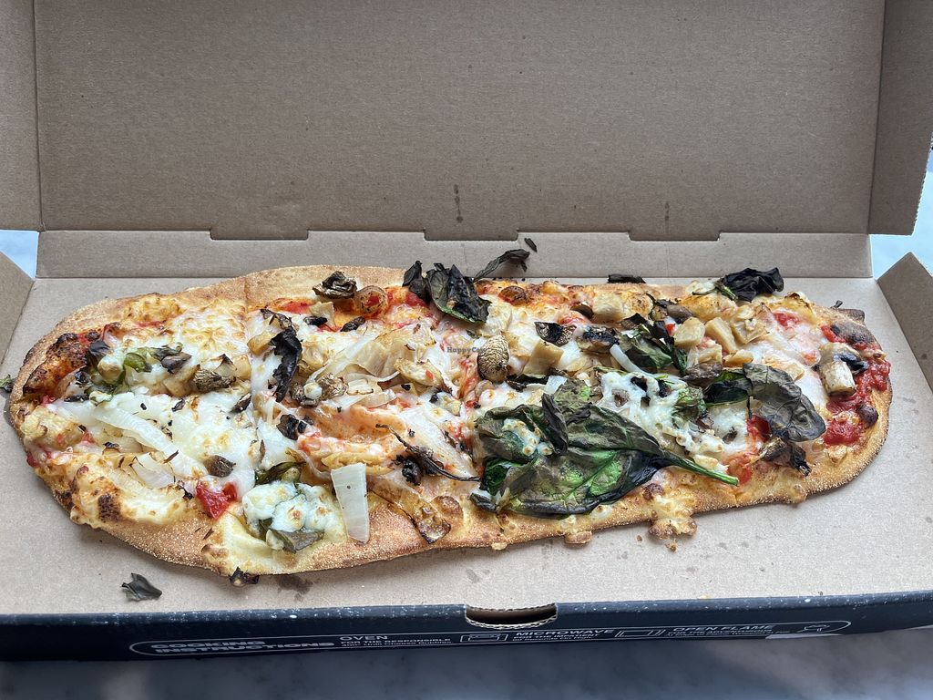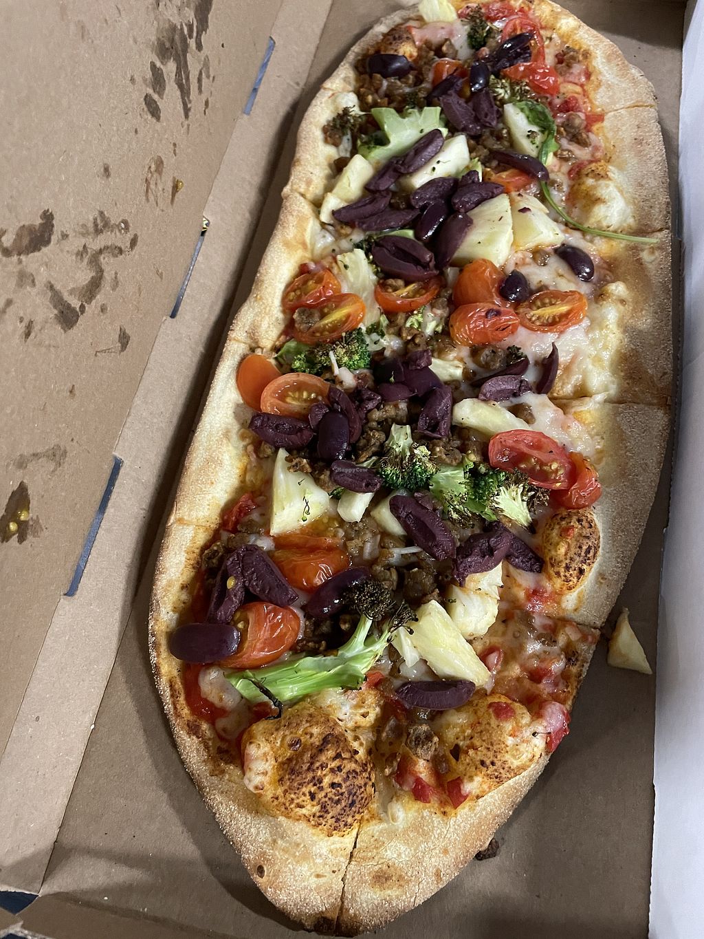 Mushrooms, onions, tomatoes, banana peppers, olives and basil. So goo…