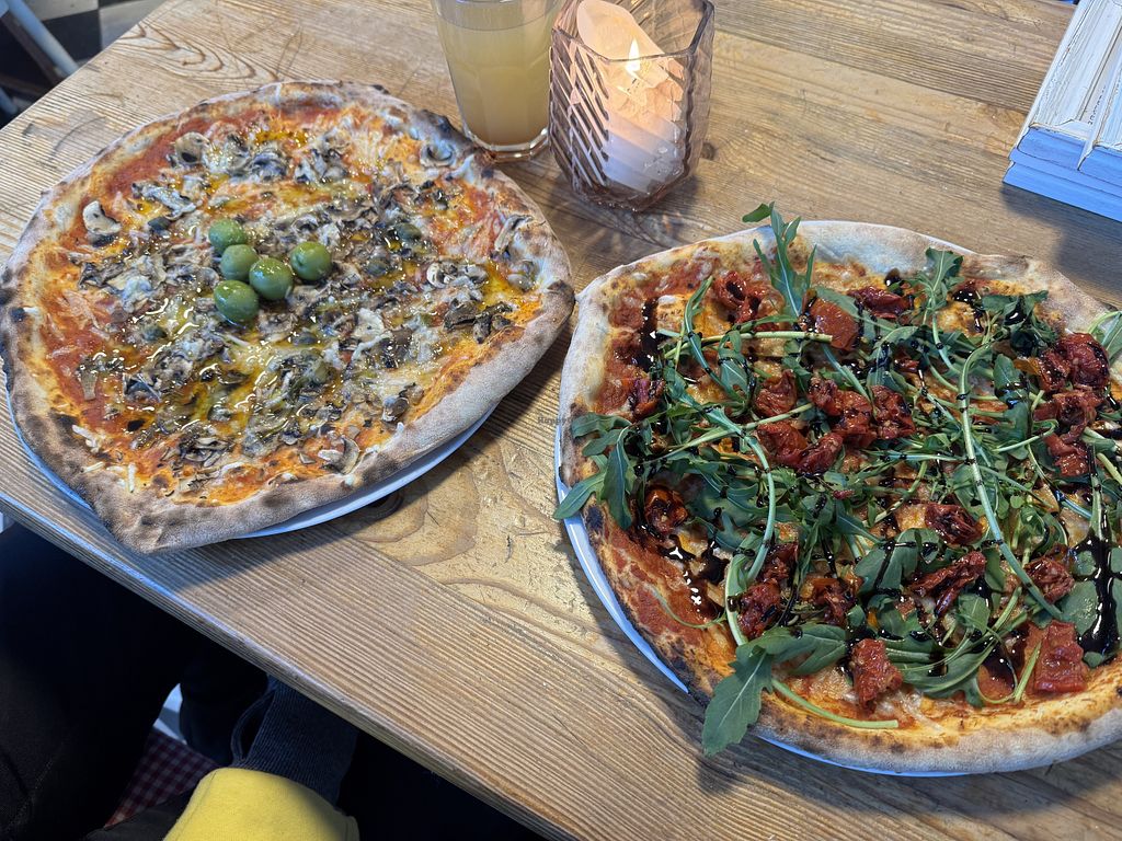 Pizzas Are large and very tasty. There was one vegan pizza on the menu, most pizzas are vegetarian and can be made vegan leaving out the cheese. Tasty homemade limos available as well, no Alkohol served!