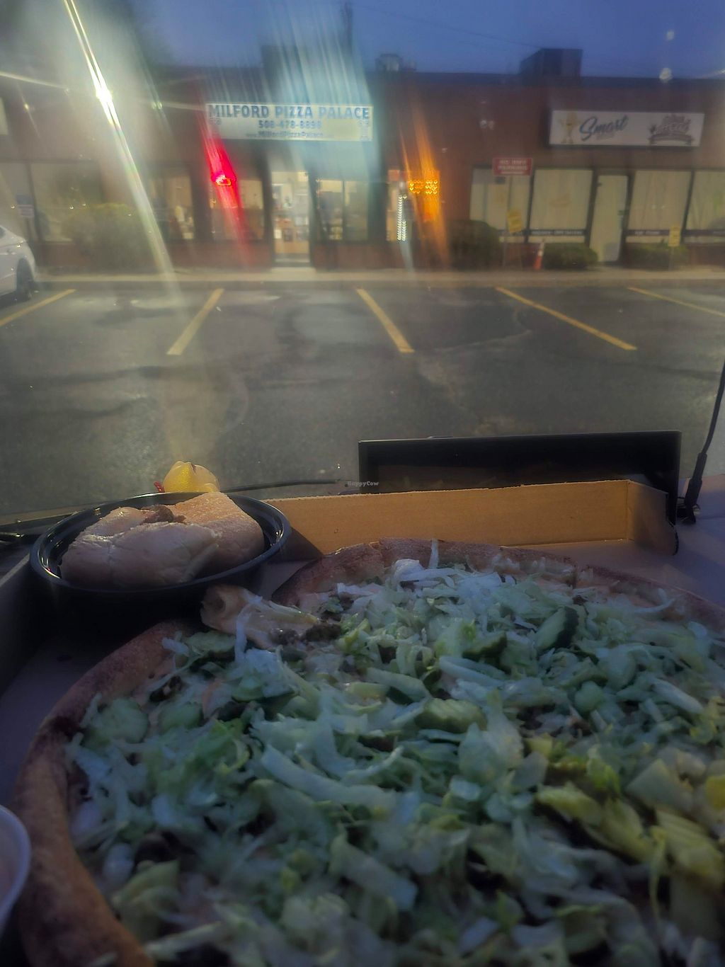 Gluten free vegan pizza- violife cheese, pickles, black olives and bey…