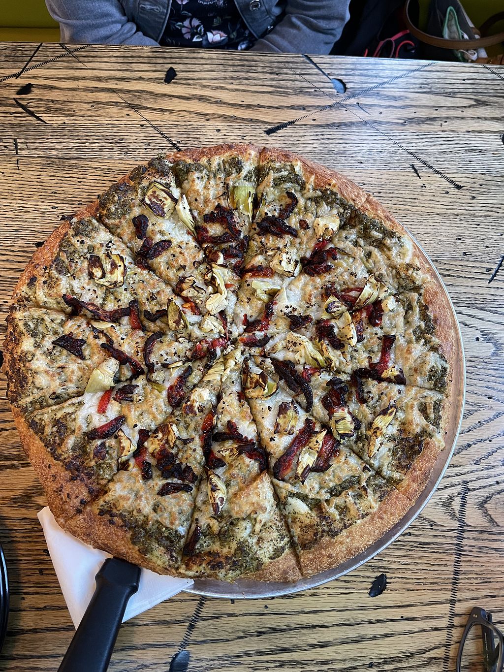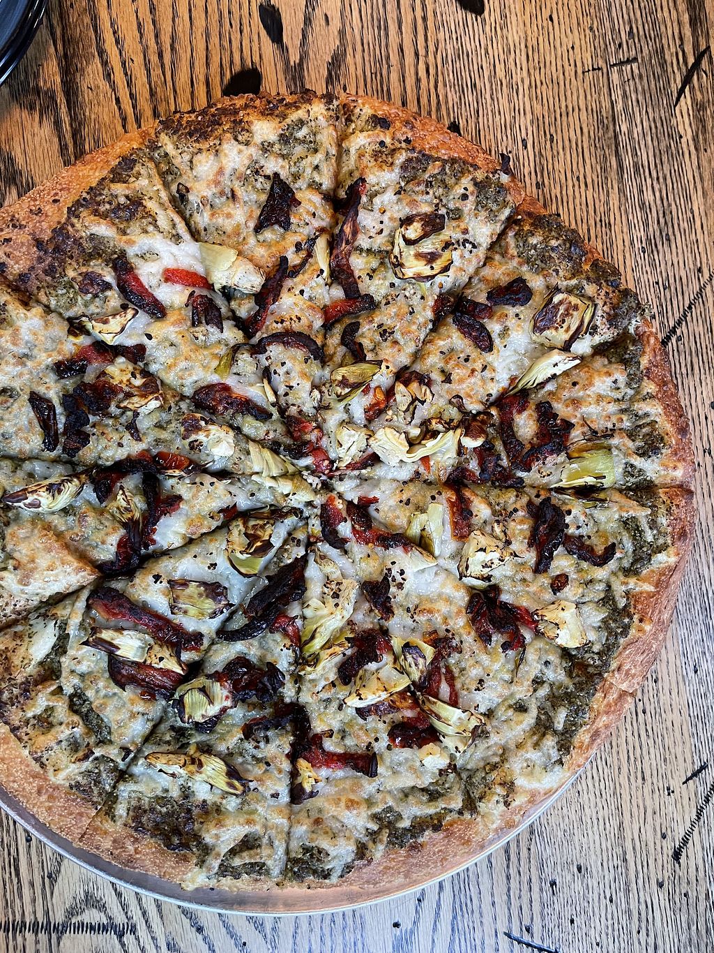 Vegan Pizza - basil pesto sauce with artichoke, sun dried tomatoes and…