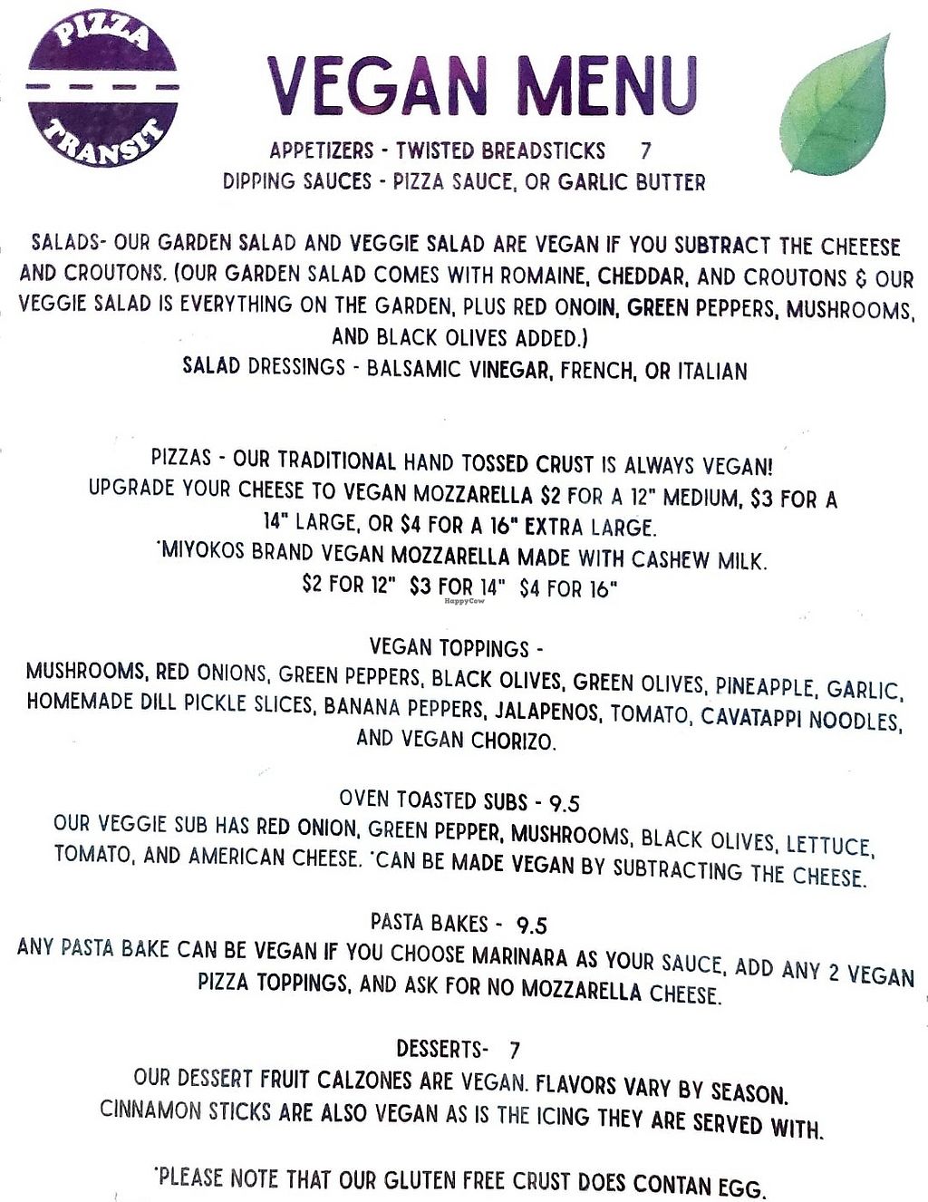 Pizza transit recently added miyokos mozzarella to their menu. They also offer vegan sausage and exclusively use nondairy butter in the kitchen.