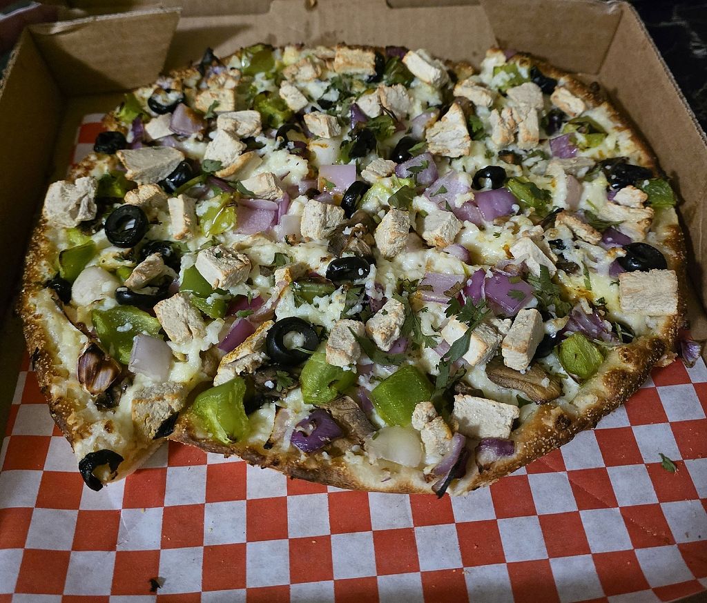We got a small vegan bombay chicken pizza. The wait was kind of long but it was very fresh when we got it. The worker was a little rude, but the pizza was really good. My non-vegan family members loved it, I wish I got more.