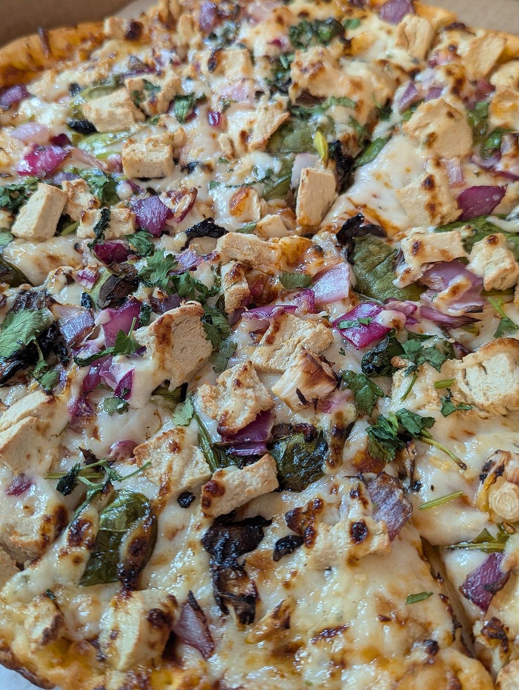 Had the “plant based” butter chicken pizza and it was pretty good. The plant based chicken was kind of dry but it was in small pieces so it was part of a larger tapestry. The cheesy bread was alright. I'd prefer it to be more garlicky but that's just me.