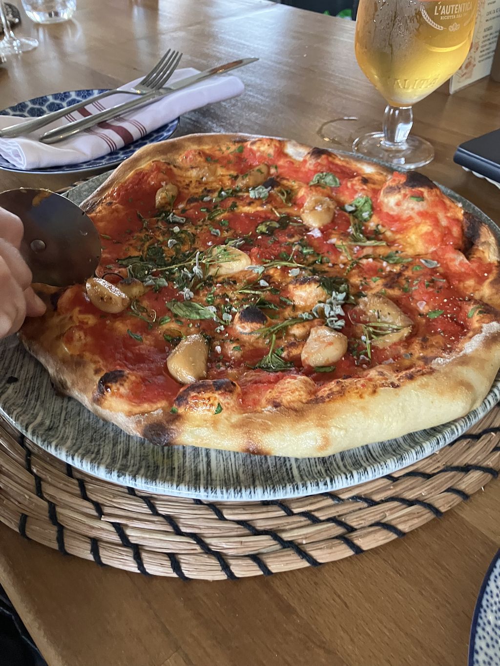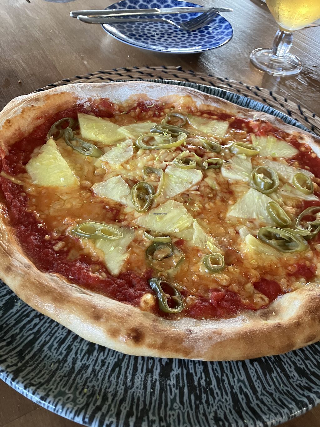 Vegan pizza, with vegan cheese, onions, mushrooms, chilli, tomatoes, b…