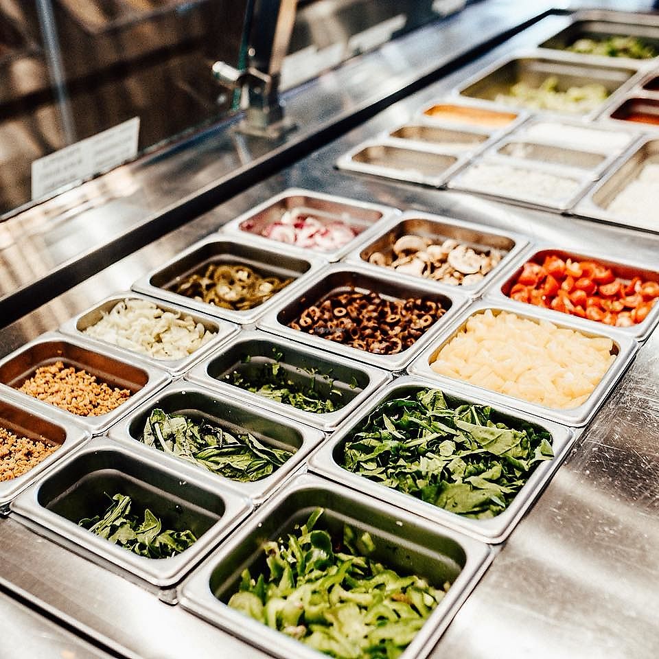 Serves meat, vegan options available. Quick service pizza franchise offering assembly style ordering of personal size pizzas. Choose the dough, sauce, and toppings you'd like. Has vegan cheese and vegan sausage. Salads are customizable as well. Founded 2012 and is based in California. Reported closed September 2023.