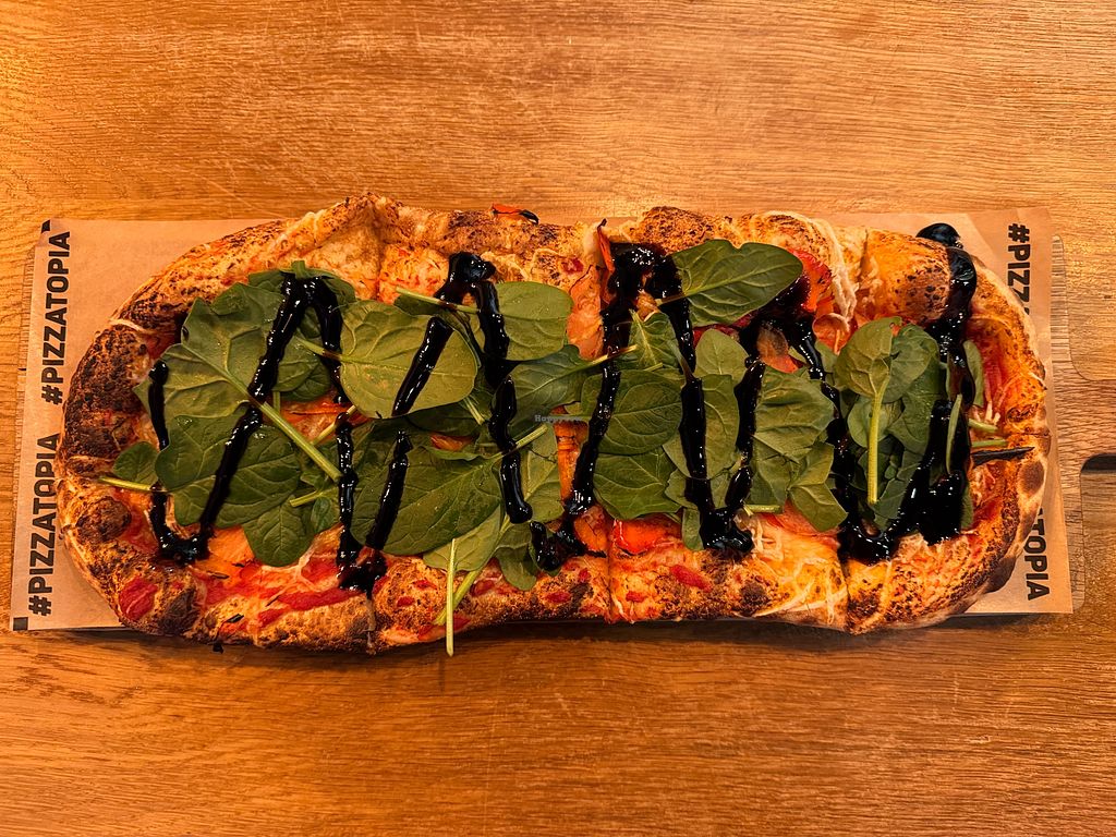 Vegantopia - vegan cheese, pelati tomato sauce, vegan bacon, spinach, …
