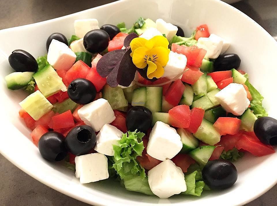 Der knackige Grieche mit grünem Blattsalat, Oliven, Tomaten, Gurken, F…